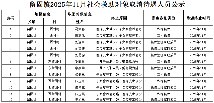 留固镇2025年11月社会救助对象取消待遇人员公示