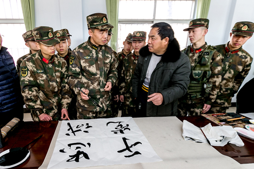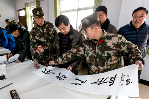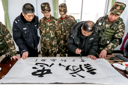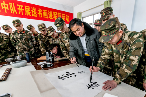 2月10日,元宵节来临之际,滑县文学艺术界联合会开展拥军笔会,县书法家协会和美术家协会10余名优秀会员来到武警驻滑县中队挥毫泼墨,以现场书法和绘画的形式表达对官兵的节日祝福,并与爱好书法和绘画的官兵切磋书画技艺,浓厚了节日氛围,丰富和活跃了军营文化生活。