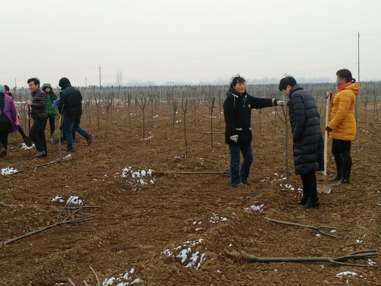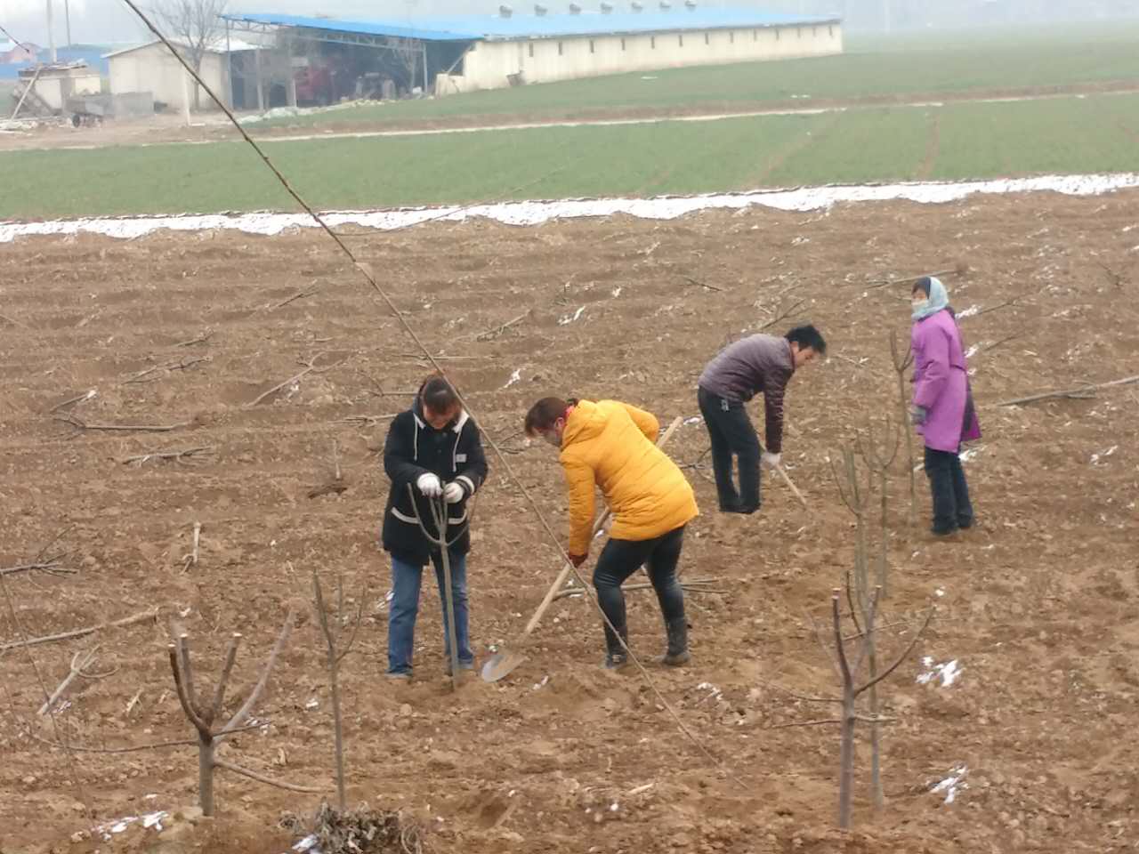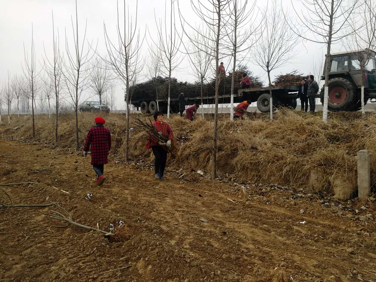 2月8日上午,阳光明媚,雨雪消融,政通大道两侧一片热火朝天的植树景象,王庄镇、老店镇的几十位村民三五人一组,将满满一大卡车的绿化树苗进行仔细分拣,并将一棵棵幼苗植入挖好的树坑,铲土填坑、挥锹培土,每道工序都做得十分认真。