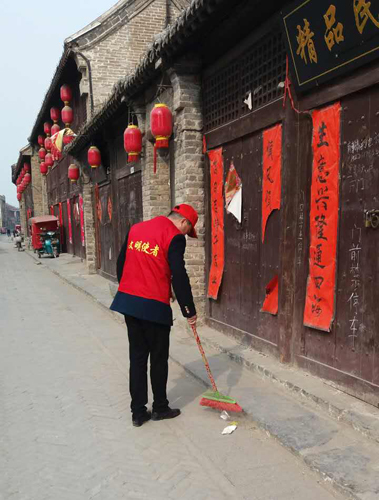 活动的主要内容是打扫古镇大集街主干道;大家拿着自带的笤帚、铲斗等打扫工具,分组对大集街主干道进行了认真的打扫。