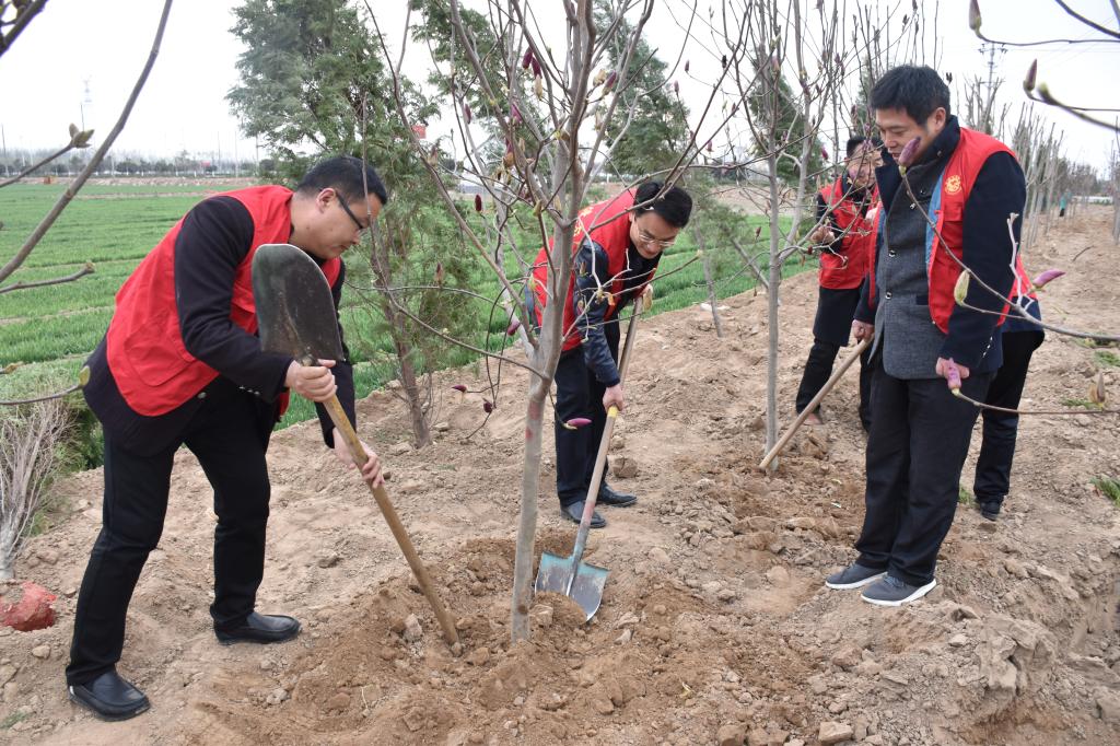 在植树现场,志愿者们有的挖树坑,有的搬树苗,有的扶苗填土,有的浇水定苗,大家挥汗如雨,干的热火朝天。经过一个多小时的劳动,共新植树苗100余棵。放眼望去,一株株新植的玉兰迎风挺立,含苞待放,在春寒料峭的三月里显得生机盎然。