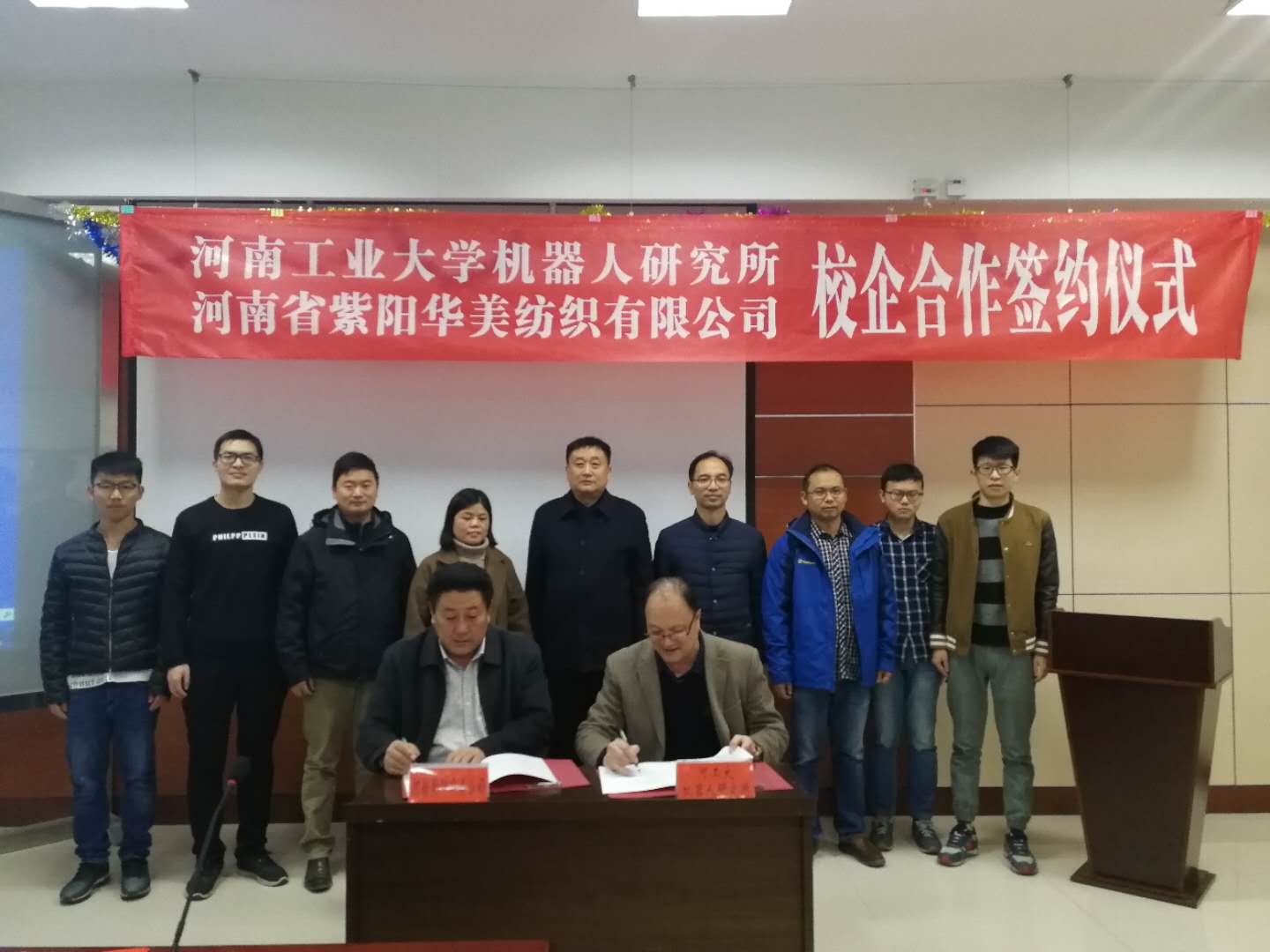 11月19日下午,县工信委在河南工业大学组织举办了河工大机器人研究所与河南紫阳华美纺织品有限公司校企合作签约仪式。河工大机器人研究所所长、研究生导师宁祎教授,紫阳华美公司董事长赵刚臣等人参加了仪式。校企双方就下步企业智能化生产、转型升级发展签订了深度合作协议。