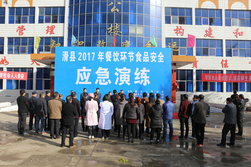 11月10日,滑县开展了餐饮环节食品安全事故应急演练。该演练由县政府主办,县食品安全委员会办公室、县食品药品监管局、县教体局、县卫计委、白道口镇政府承办。