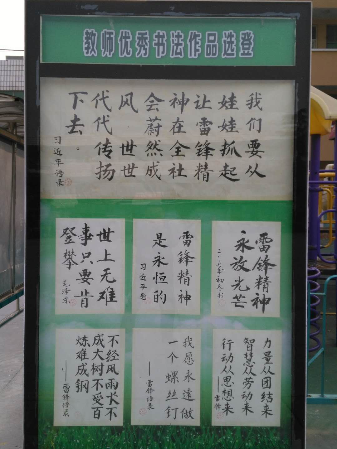 展出作品共有6个内容:一是毛泽东等老一辈为雷锋同志的题词教师书法作品;二是雷锋同志全心全意为人民服务的故事教师绘画作品;三是学生制作有关雷锋生平事迹的手抄报;四是《雷锋日记》摘抄学生书写规范字作品;五是《发生在我们学校的雷锋故事》学生作文;六是《我和雷锋叔叔说说悄悄话》学生感言。