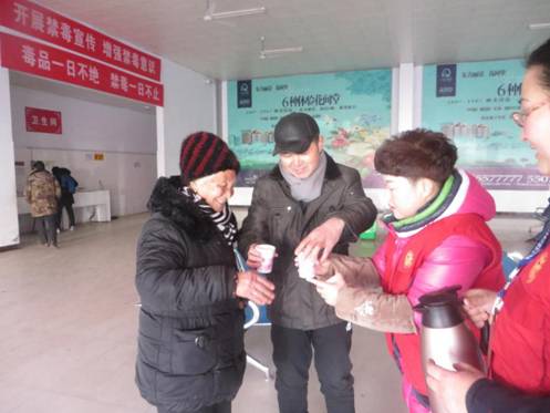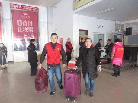 活动中,志愿者热情地帮过往乘客购票、拿行李,为候车的乘客提供开水,切实为每一位旅客送上浓浓的暖意。