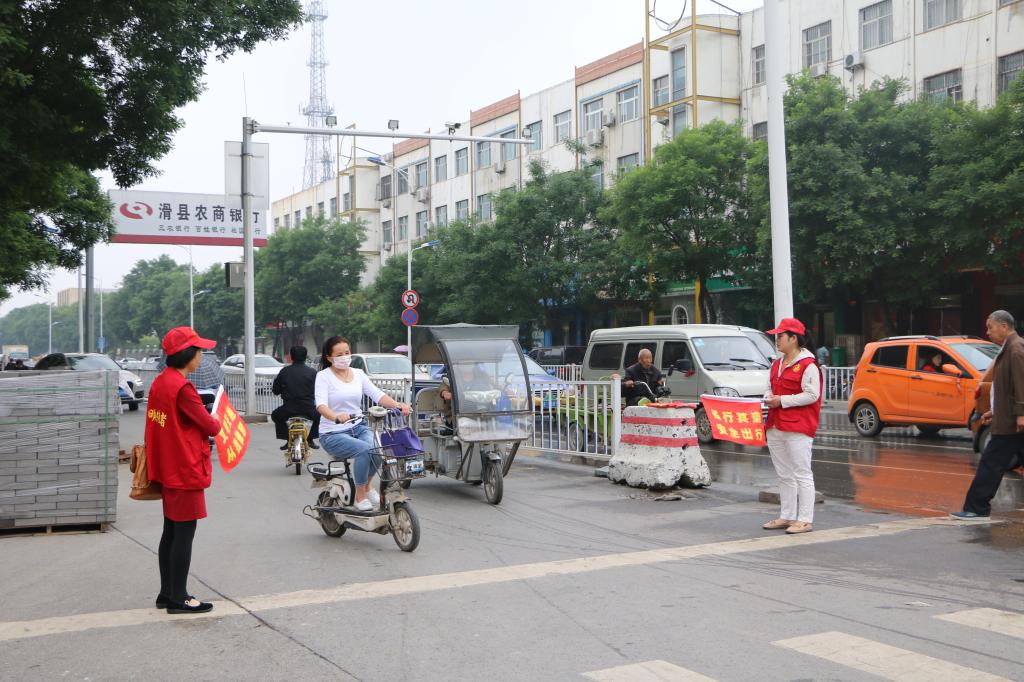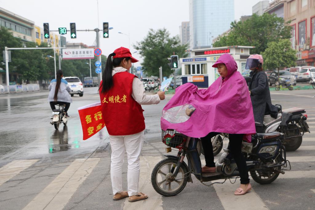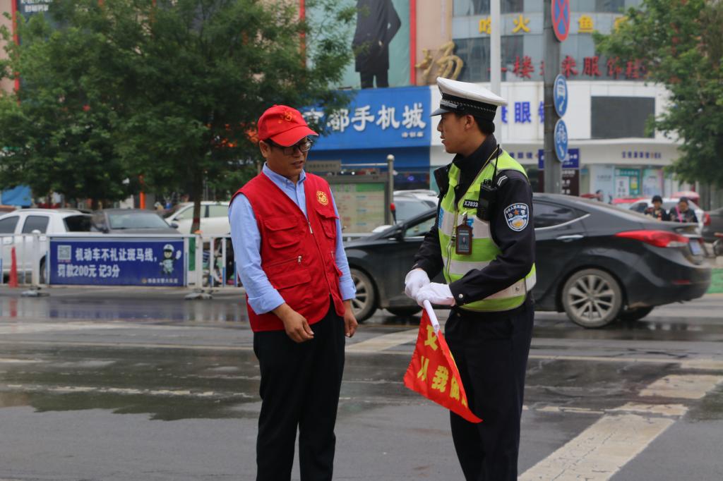 活动过程中,志愿者们分两组站在人流比较多的两个路口协助交警维护正常的交通秩序,劝阻乱闯红灯、乱停车辆、非机动车占用机动车道等不文明行为。同时,志愿者们还向过往行人发放了印有交通知识的小扇子。
