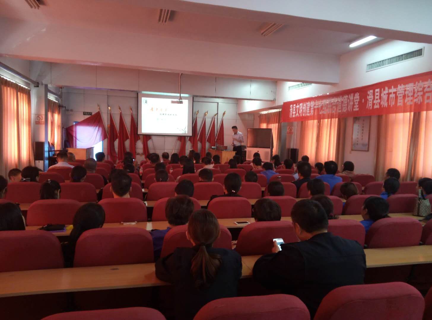 9月30日下午,滑县文明单位第十七组联合道德讲堂在滑县城市管理综合执法局四楼会议室开讲,本次道德讲堂由县城市管理综合执法局主办,县食药监局、质监局、移动公司、便民服务中心、农机局协办,65名干部职工参加了此次活动。