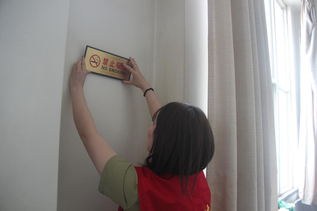 活动中,志愿者们在局各个办公室墙上张贴禁烟标识、桌面摆放禁烟标语,并通过局电子屏宣传,现场制止吸烟行为等方式对局干部职工宣传吸烟的危害、推广戒烟的措施和方法等,提高了对吸烟与二手烟的危害的正确的认识。
