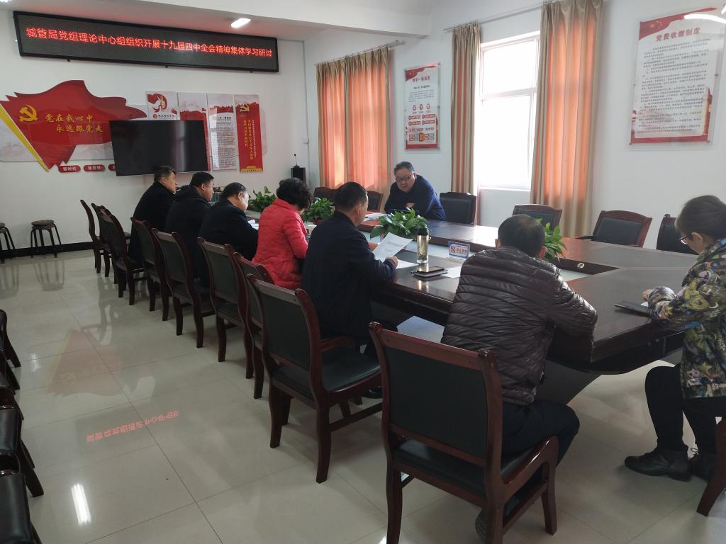 11月27日下午,滑县城市管理局党组理论学习中心组召开党的十九届四中全会精神专题学习研讨会,重点围绕习近平总书记代表中央政治局在党的十九届四中全会上作的工作报告和全会精神学习宣传工作进行交流。局党组书记、局长刘现涛主持会议,局党组成员参加会议。