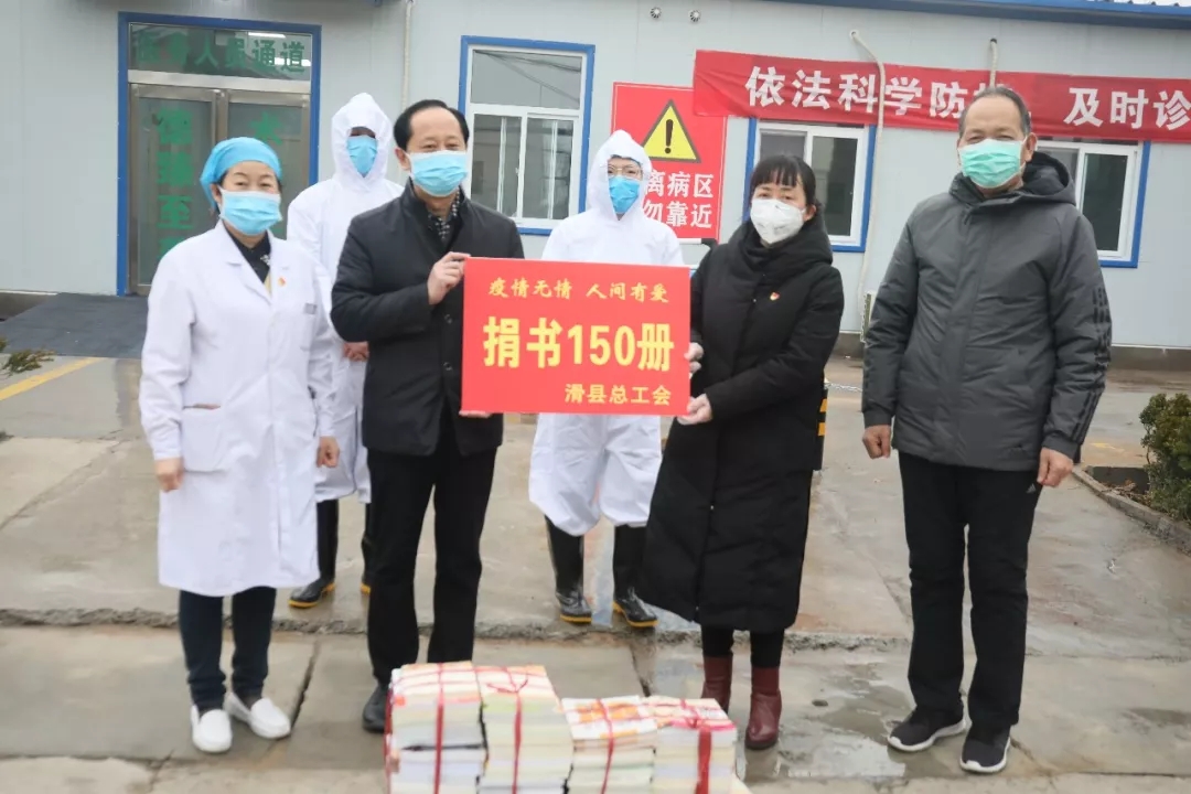 为满足隔离留观人员的精神文化需求,万众一心,抗击疫情,坚决打赢疫情阻击战,2月14日上午,滑县人民政府副县长、总工会主席郑进武一行来到滑县中心医院东院区(滑县传染病区)看望慰问一线医务人员,并给医院隔离留观区留观人员送来了150册图书,县中心医院领导接受了物资捐赠,并对县总工会的慰问表示感谢。