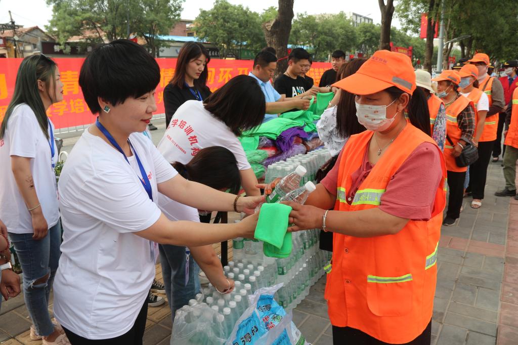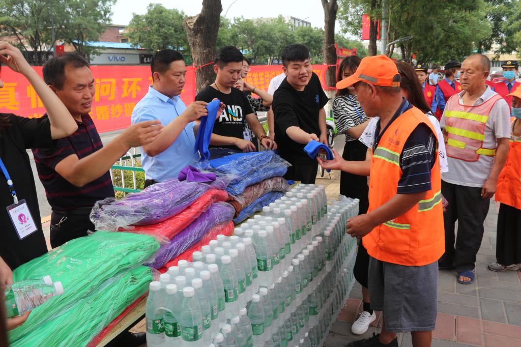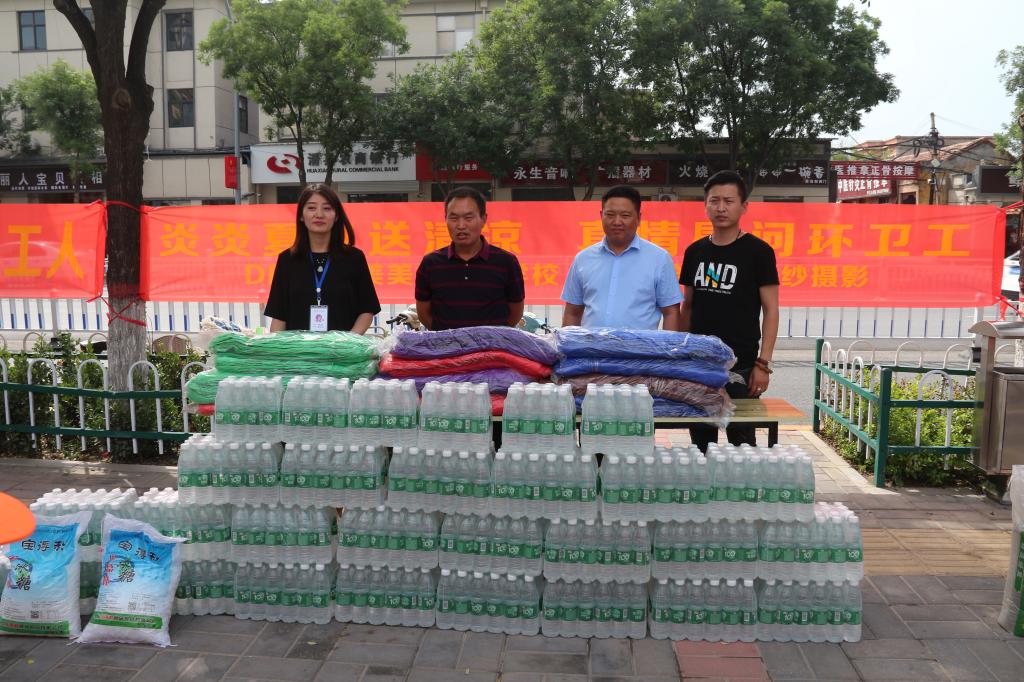 “传递爱,送清凉”。为让辛勤工作在一线岗位上的环卫工人过一个清凉的夏日,6月19日下午,滑县DF·妆颜美美学培训学校和光合流年婚纱摄影两家爱心企业组织了“炎炎夏日送清凉真情慰问环卫工”爱心捐赠活动,向环卫工人送去了矿泉水、绿豆、冰糖、毛巾等降温防暑慰问品,为滑县城区七百多名环卫工送去了夏日的一份清凉,感谢他们为城市的整洁、亮丽付出的辛勤劳动。