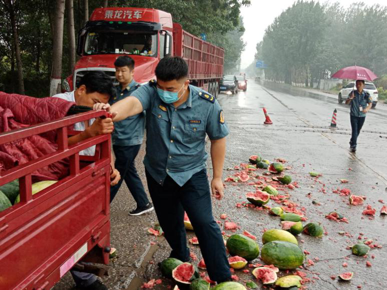 7月17日的清晨,淅淅沥沥的小雨四处飞洒,带着清新明快的旋律,含情脉脉的音韵,把人引入遐想的意境。突然,“哐当”一声打破了滑县城关超限超载检测站门前的这份美景,在外值班的执法人员应声望去,只见路中间满地破碎的西瓜,随之一股泥土还夹带着西瓜的味道扑鼻而来,执法人员赶紧走过去,原来是一辆拉西瓜的机动三轮,由于车厢栏板没有安装到位,经过长时间的颠簸导致栏板松开,这才致使西瓜洒落一地