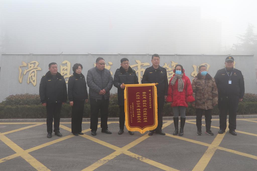 1月26日上午,水果零售商户何朋,给滑县城市管理局送来一面锦旗,对城管为民解忧和热忱服务表示感谢。锦旗上写着的“严执法 讲公正 铸城管新风采 察民意 解民忧 为民排忧解难”,不但是对城管队员温情执法感激之情的表达,也是对城管工作的极大肯定。