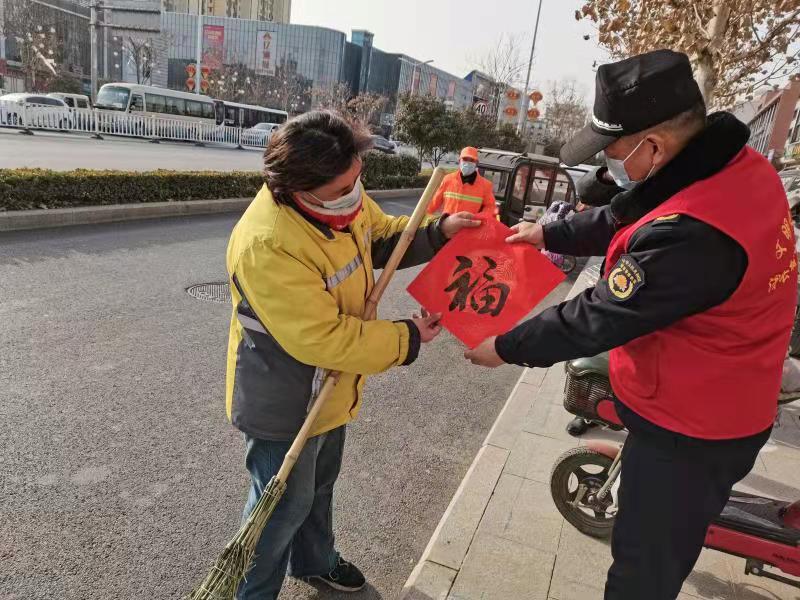 2月1日,滑县城市管理局党员志愿者们走进县城体育广场、大云寺广场、人民路、中州大道、解放路、振兴路、白马路等街巷,为正在一线工作的环卫工人们送去祝“福”,一张张映衬着环卫工人笑容的大红“福”字,饱含着城管人对环卫工人的深深敬意和由衷祝福。这是滑县城市管理局开展的“迎新春送‘福’字 情暖环卫工”活动的一幕。