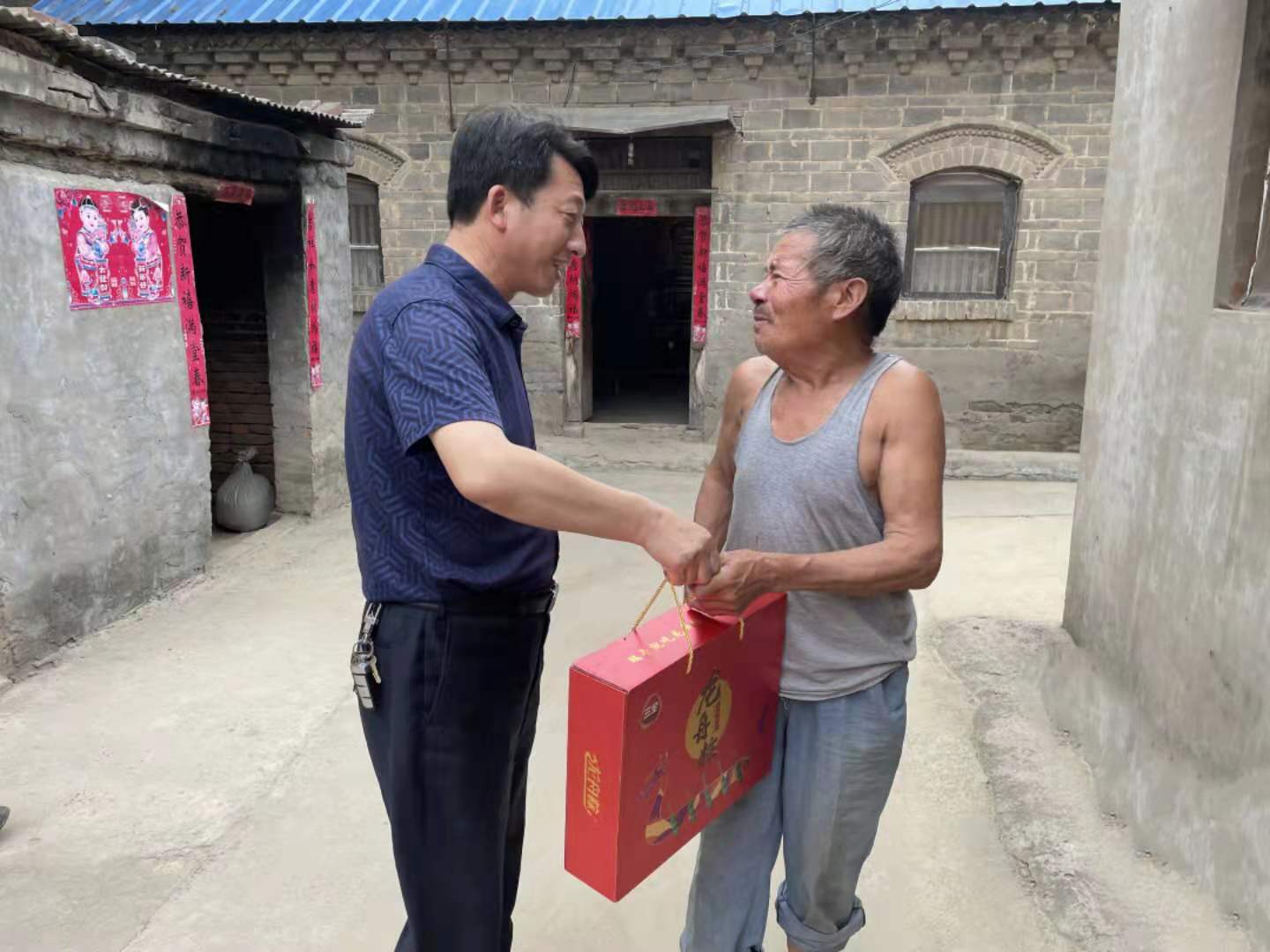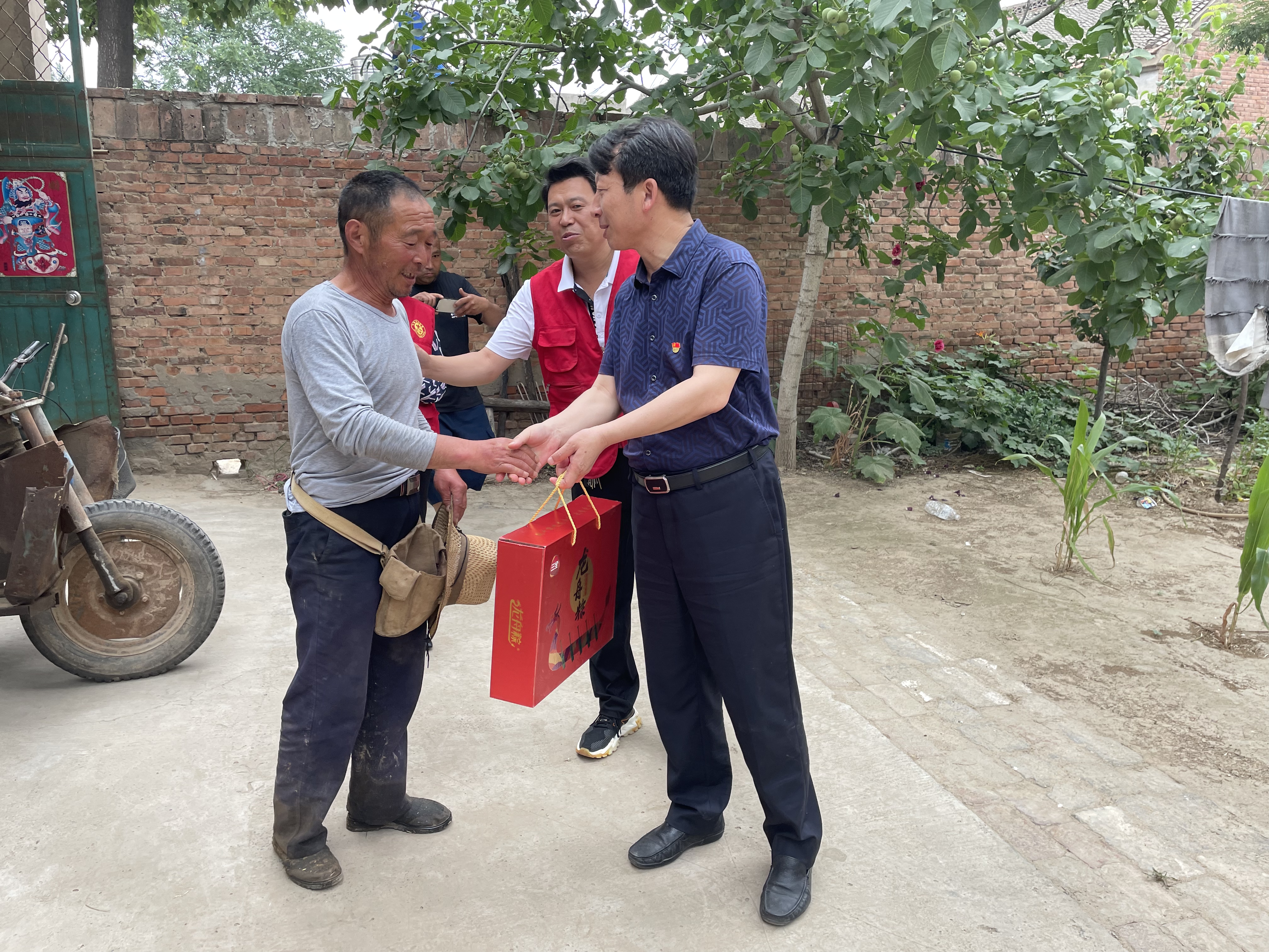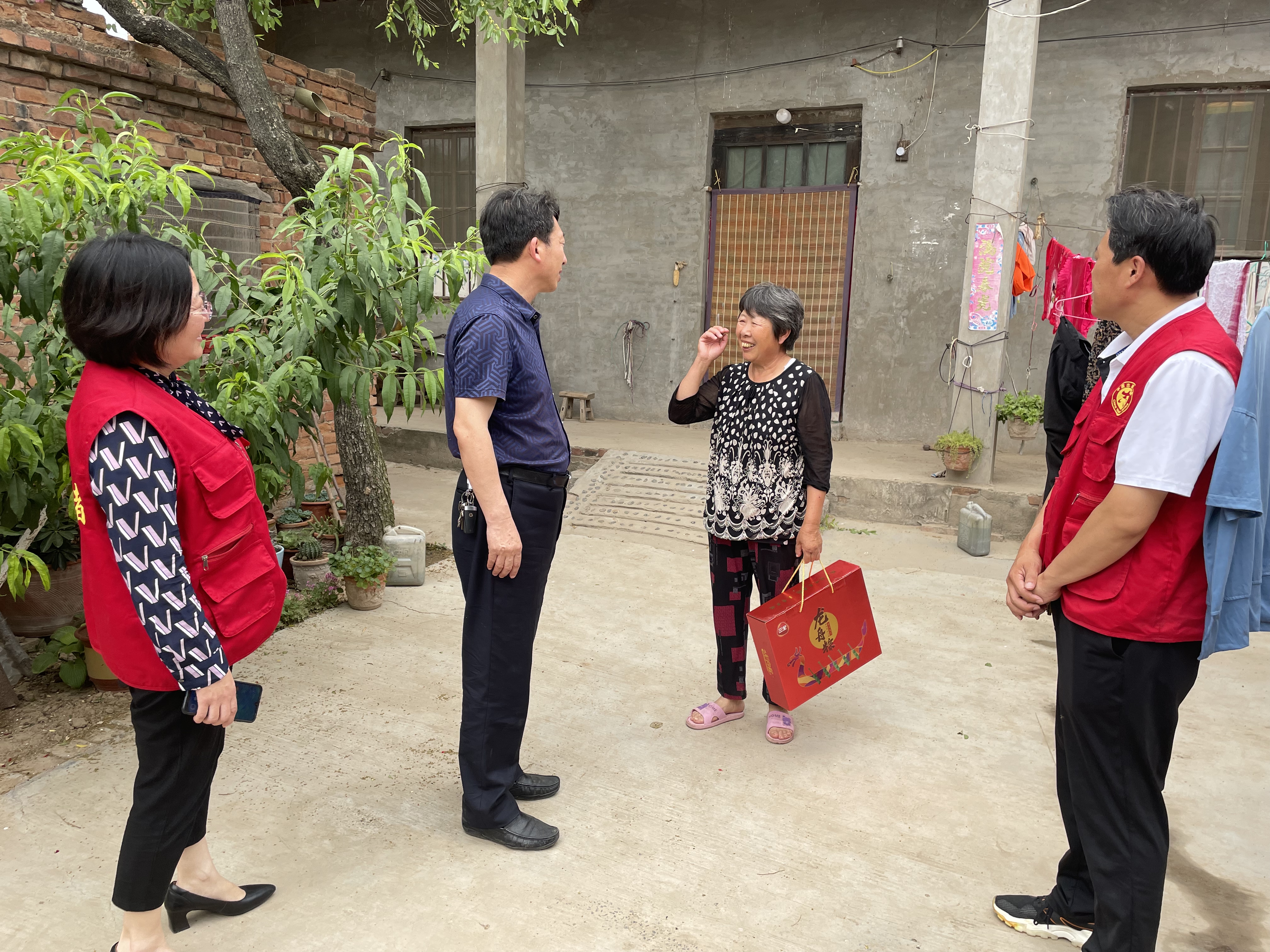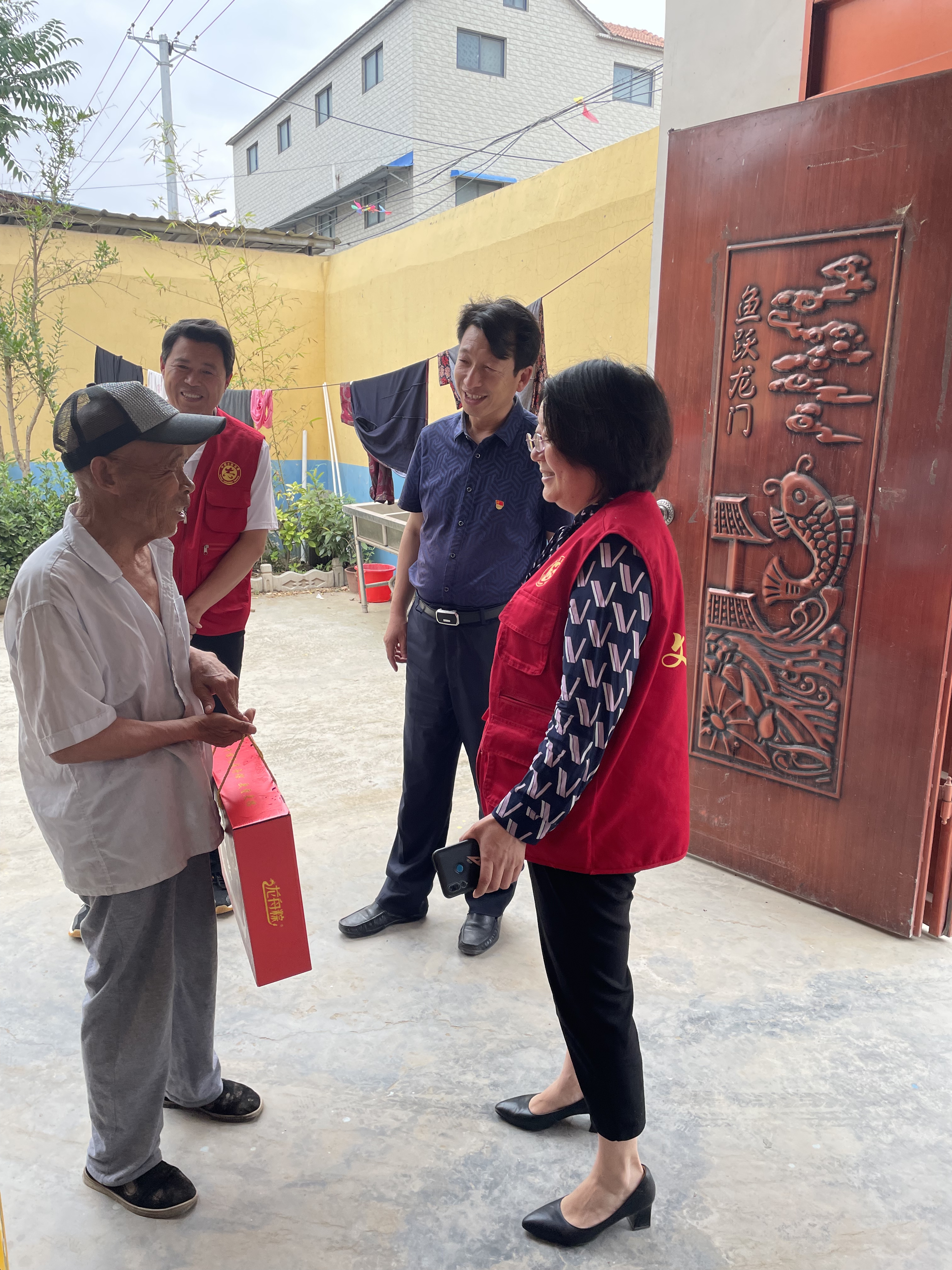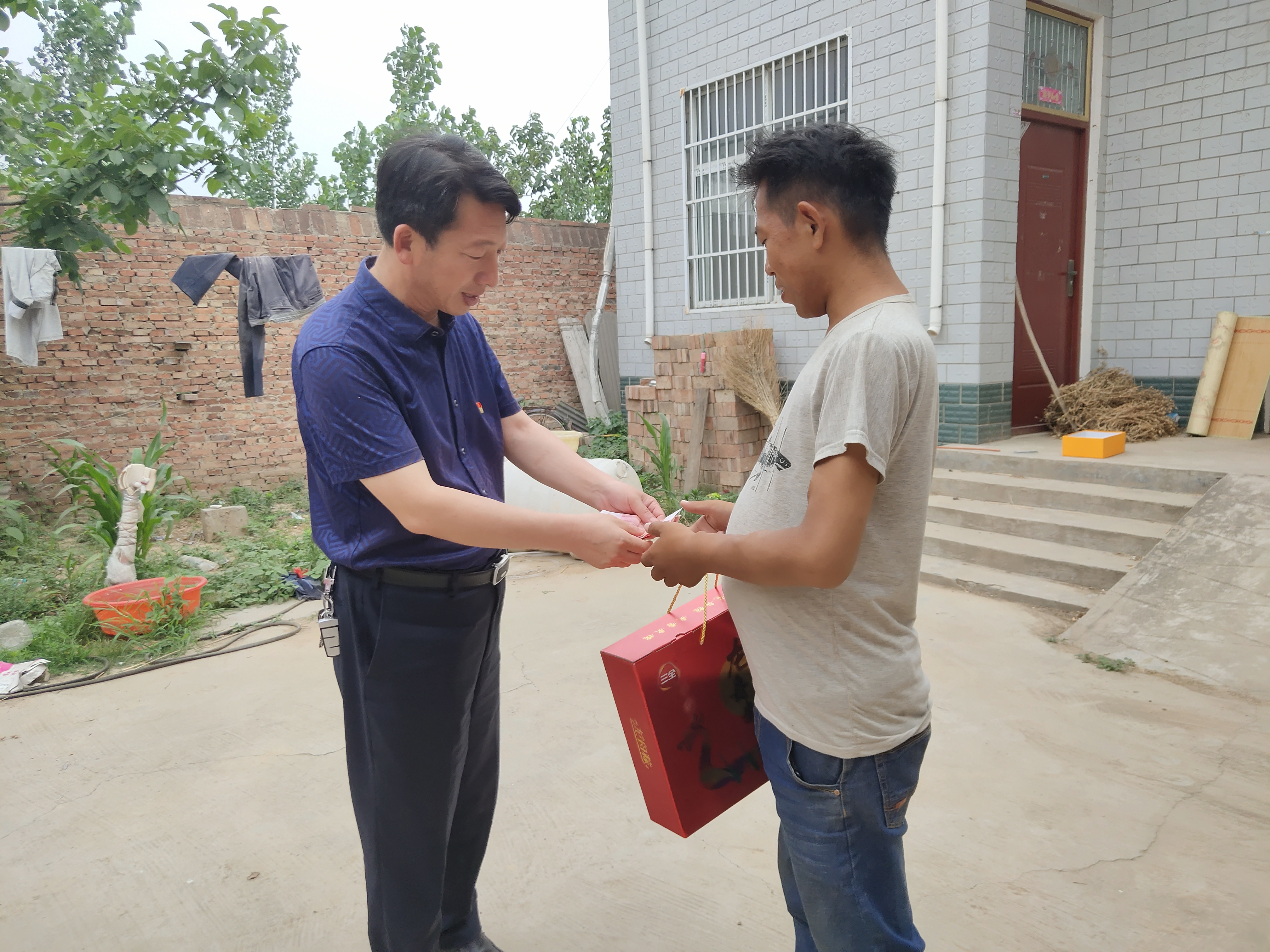 工作队一行带着节日慰问品,逐一深入每个联系户家中,嘘寒问暖,并送上节日礼品——粽子,表达党和政府对他们的关爱之情。当来到联系户付海省家中,看到付海胜的儿子付家家年纪轻轻就患尿毒症,放下慰问品后,徐建立又从口袋掏出自己的300元钱,递到付家家手中;并鼓励他有党和政府为民解难,自己要增加信心,一定能够战胜疾病。