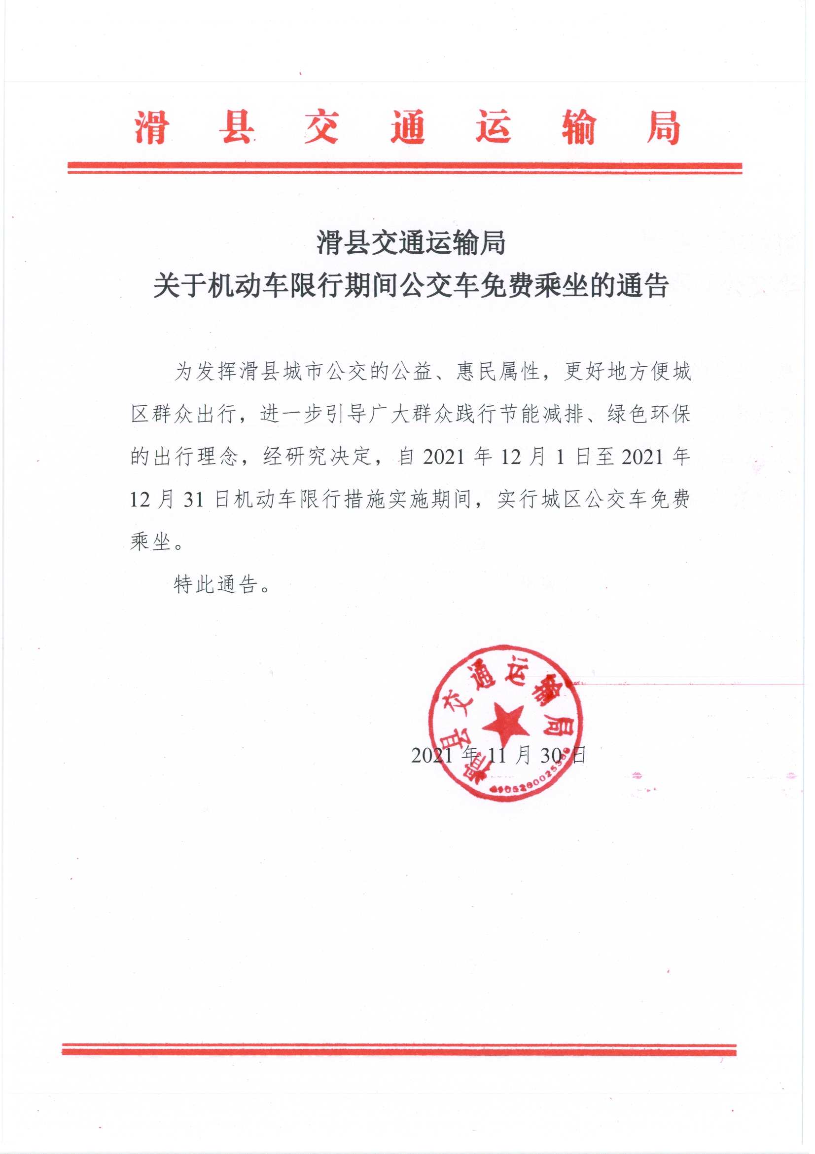 “为发挥滑县城市公交的公益、惠民属性,更好地方便城区群众出行,进一步引导广大群众践行节能减排、绿色环保的出行理念,经研究决定,自2021年12月1日至2021年12月31日机动车限行措施实施期间,实行城区公交车免费乘坐。”近日,县交通运输局的一则通告在微信朋友圈广泛传播,赢得了广大市民交口称赞。