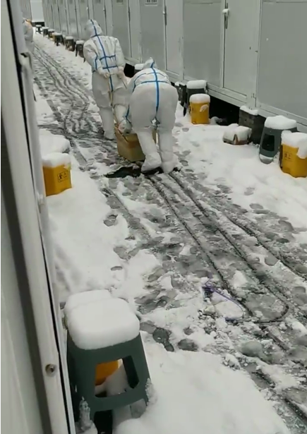 1月20日大雪纷纷,这场大雪对于隔离点的医护人员来说更是雪上加霜。平常简单的送餐和采核酸,在风雪中变的更加困难。数九寒天,冷风刺骨,医护人员们无法在防护服内穿着厚实的衣物,但是却必须要在户外坚持工作。轻薄的棉衣无法抵御寒冷,让他们坚持下去的是一腔热血和与病毒斗争的坚强意志。