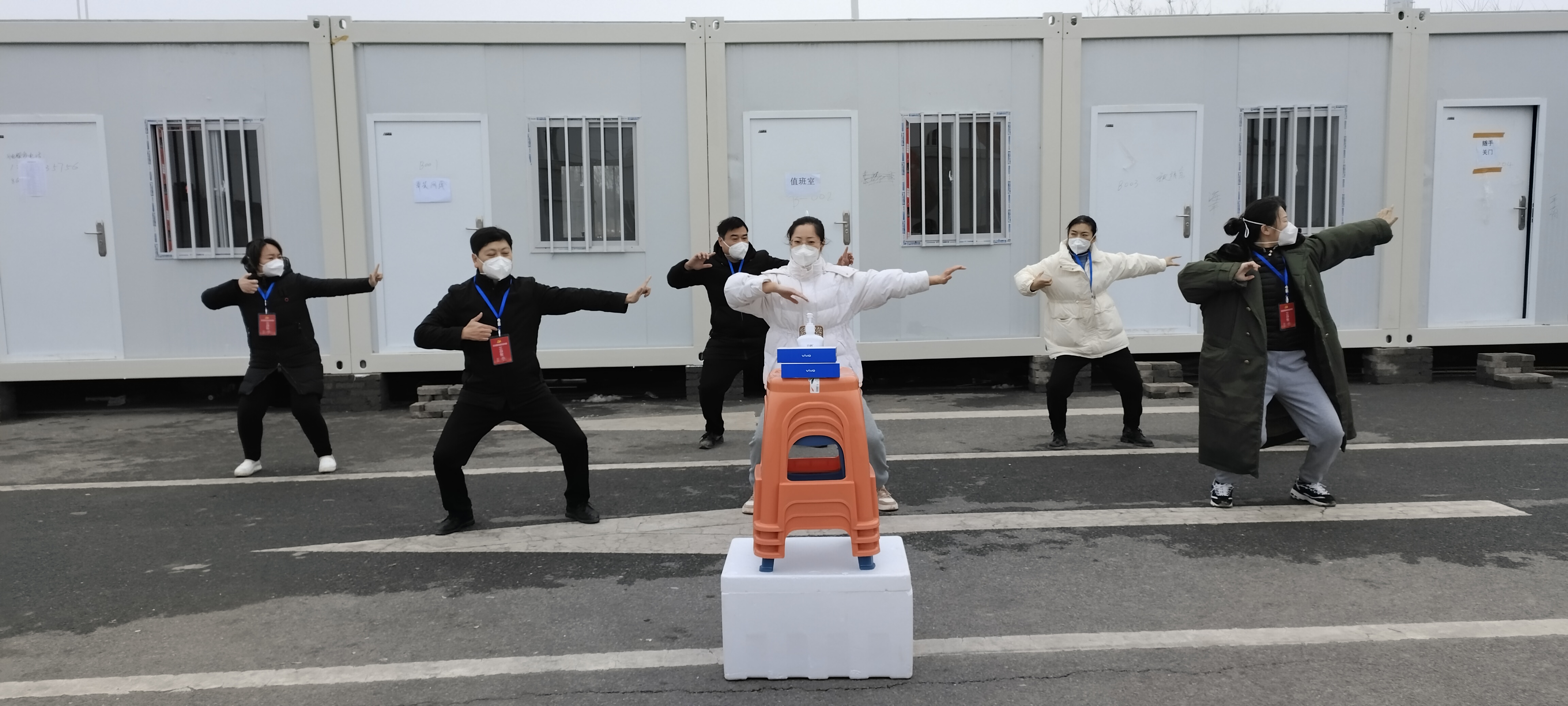 在汤阴方仓隔离点,申焕教授八段锦的视频在微信群里一推送,就引起了隔离人员的共鸣,纷纷争相练习,换岗的工作人员也和她一起进行八段锦的锻炼。
