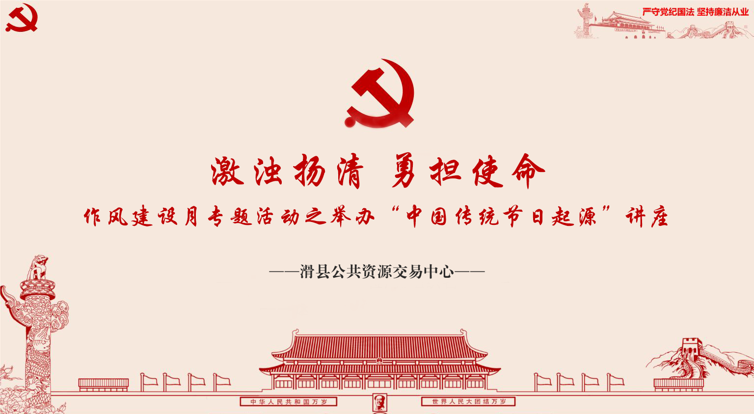 中华文化积淀着中华民族最深沉的精神追求,而传统节日是中华文化的精髓,为汲取优秀传统文化思想精华,进一步坚定文化自信、增强文化自觉,根据县公共资源交易中心《关于开展“激浊扬清 勇担使命”作风建设月活动的实施方案》安排,近日,交易中心以“中国传统节日起源”为主题,进行了一次生动有趣的讲座。