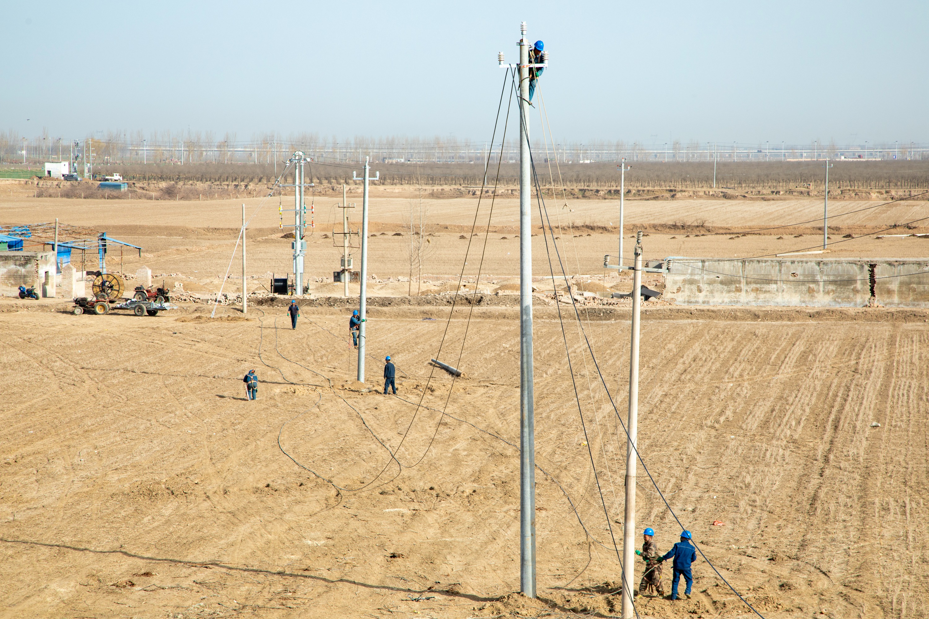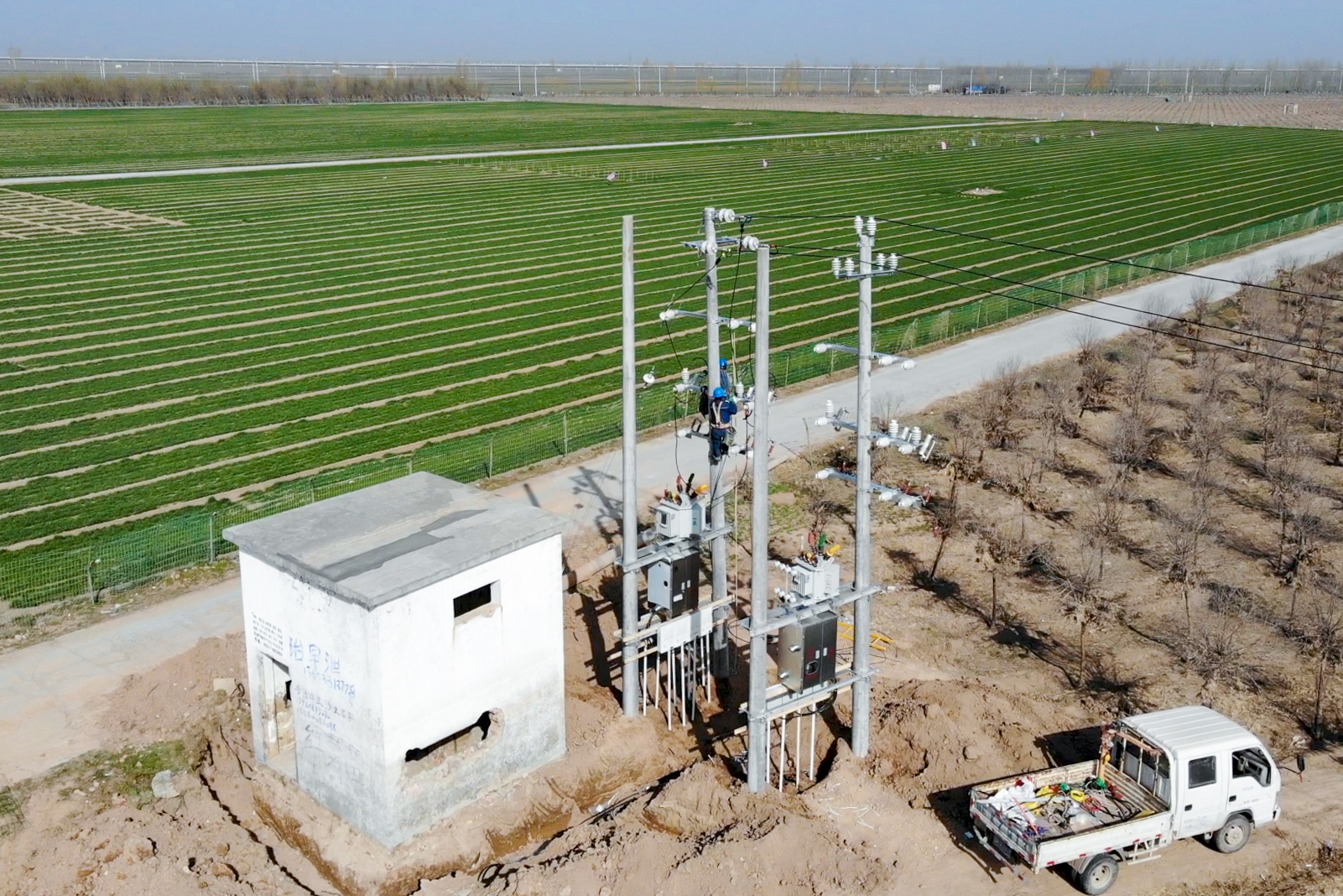 3月9日,春回大地,万物竞长,在河南滑县长虹坡蓄滞洪区一望无际的田地里,青翠麦苗茁壮成长。国网滑县供电公司宋德俭等16名电力工人正在加紧施工,升级改造农排电力设施,确保麦苗喝足“返青水”。