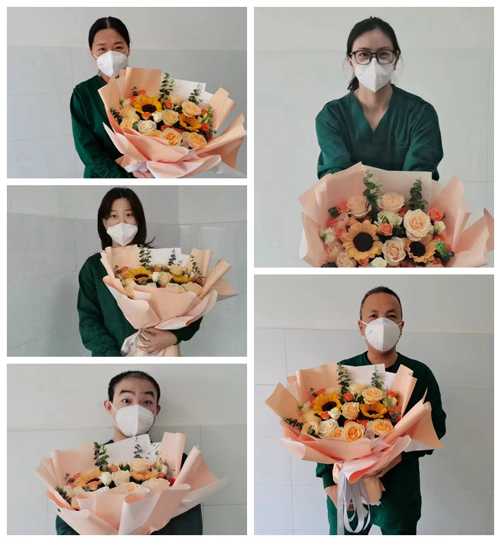 在滑安驿站中,滑县中心医院驻点的医护人员放弃了五一节假日,放弃了与家人的陪伴,舍小家为大家投身疫情防控。恰逢驻点医护董利彩、熊建华、李晓丹、任静、刘宁飞的生日都在五月份,5月9日,滑县中心医院副院长魏健、副院长陈光辉、副院长朱瑞林、医院党委委员张馨予、院工会主席张会遵、副院长谢佳威来到滑安驿站隔离点,给坚守在隔离点的“大白”寿星送上了鲜花、蛋糕和生日祝福。