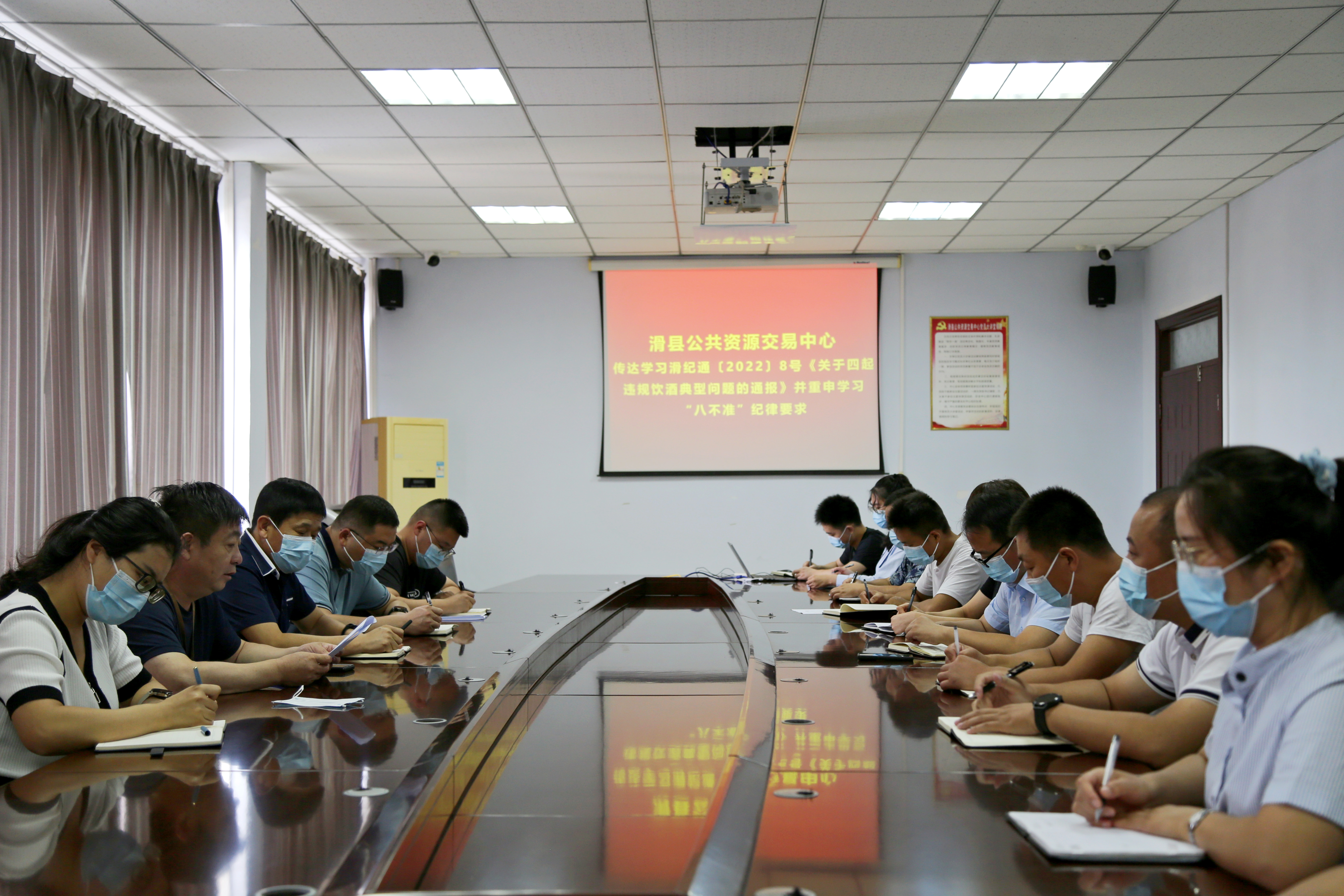 7月28日上午,县公共资源交易中心组织全体干部职工召开会议,传达学习《关于四起违规饮酒典型问题的通报》(滑纪通〔2022〕8号),重申学习“八不准”纪律要求,进一步严明纪律规矩,教育引导中心全体干部职工遵纪守法,坚决遏制酒驾醉驾等违纪违法行为。