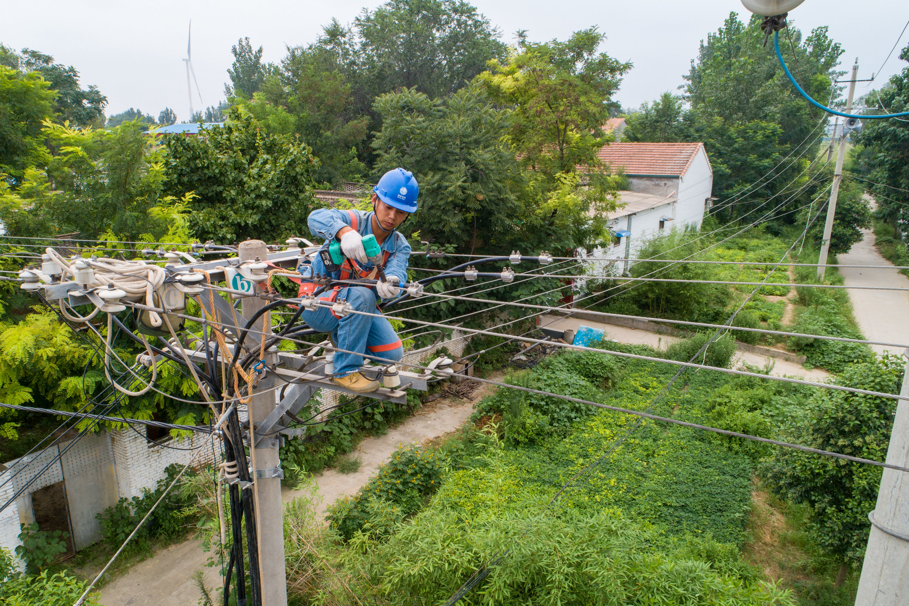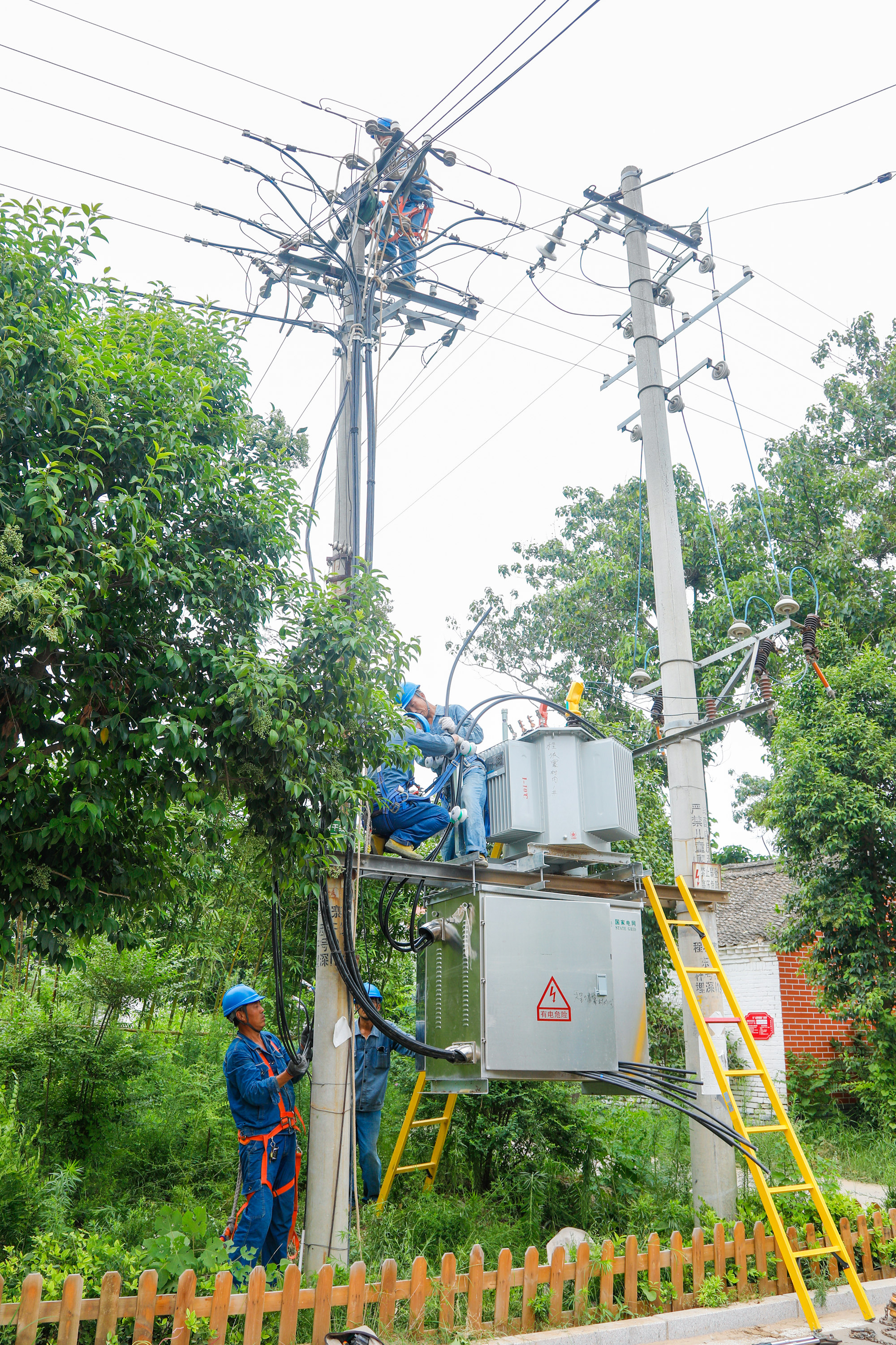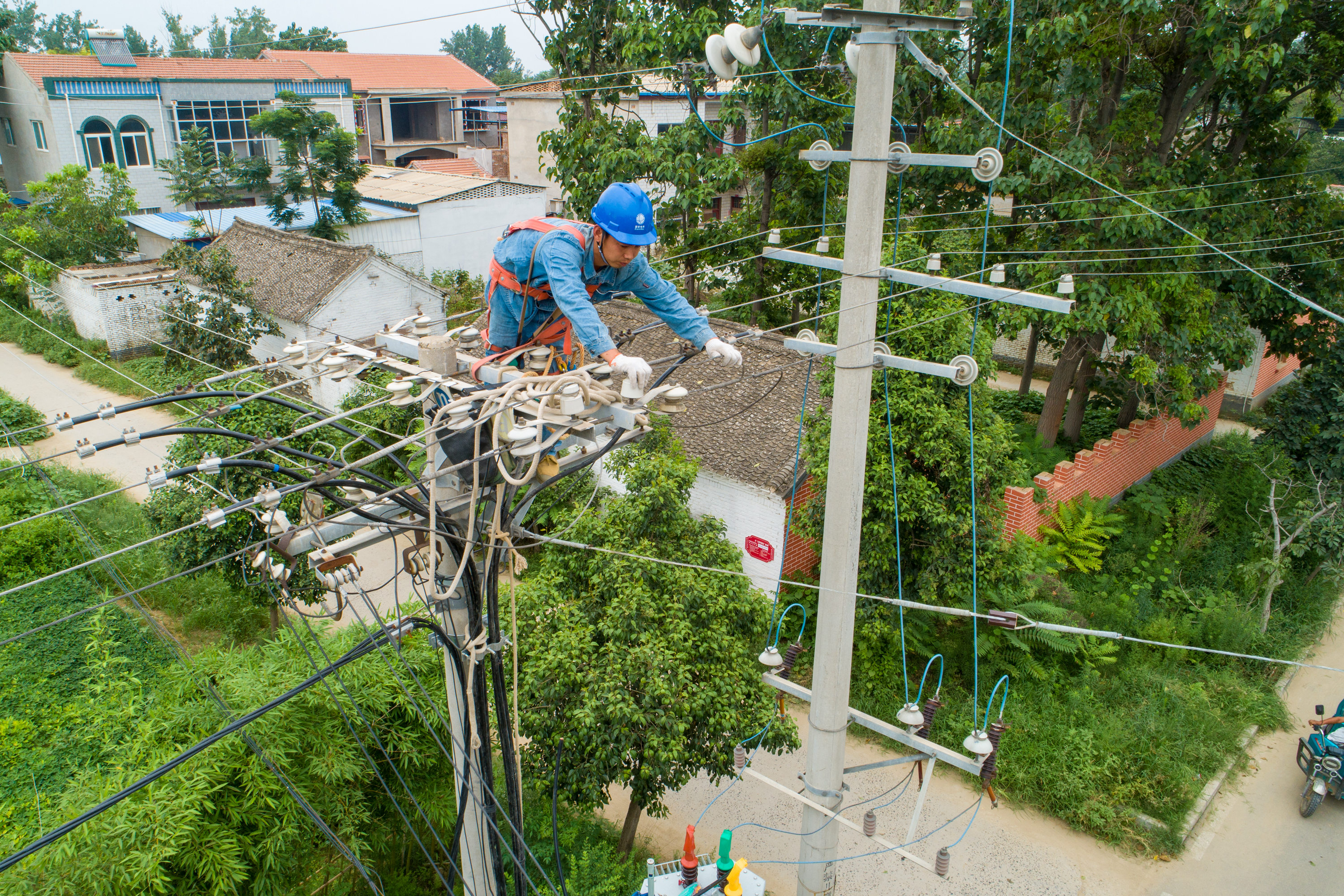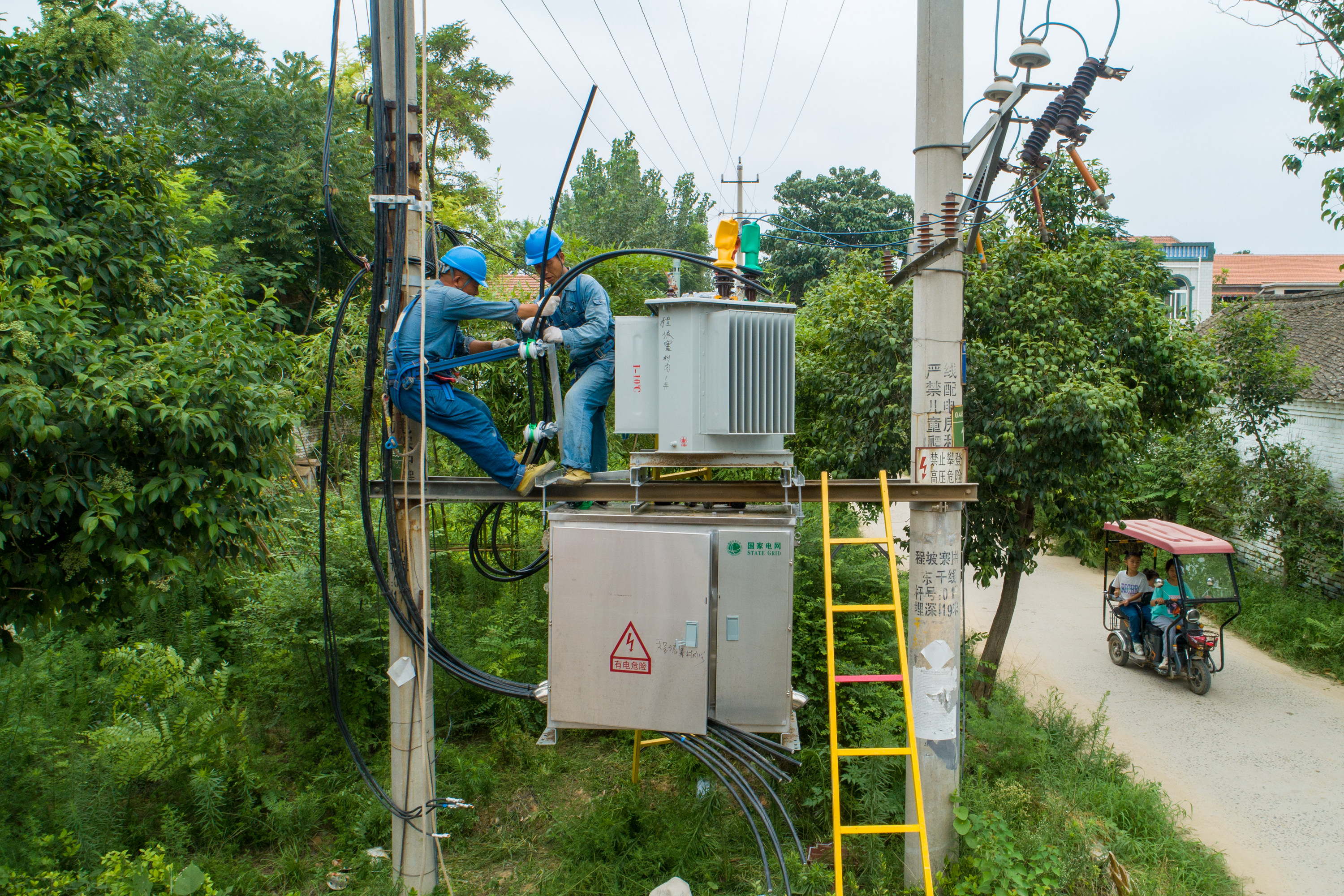 立杆、架线、安装变压器……8月15日,在河南滑县牛屯镇程坡寨村,国网滑县供电公司赵瑞杰、王金有等8名施工人员正进行紧张施工,对村内1号台区进行增容改造。