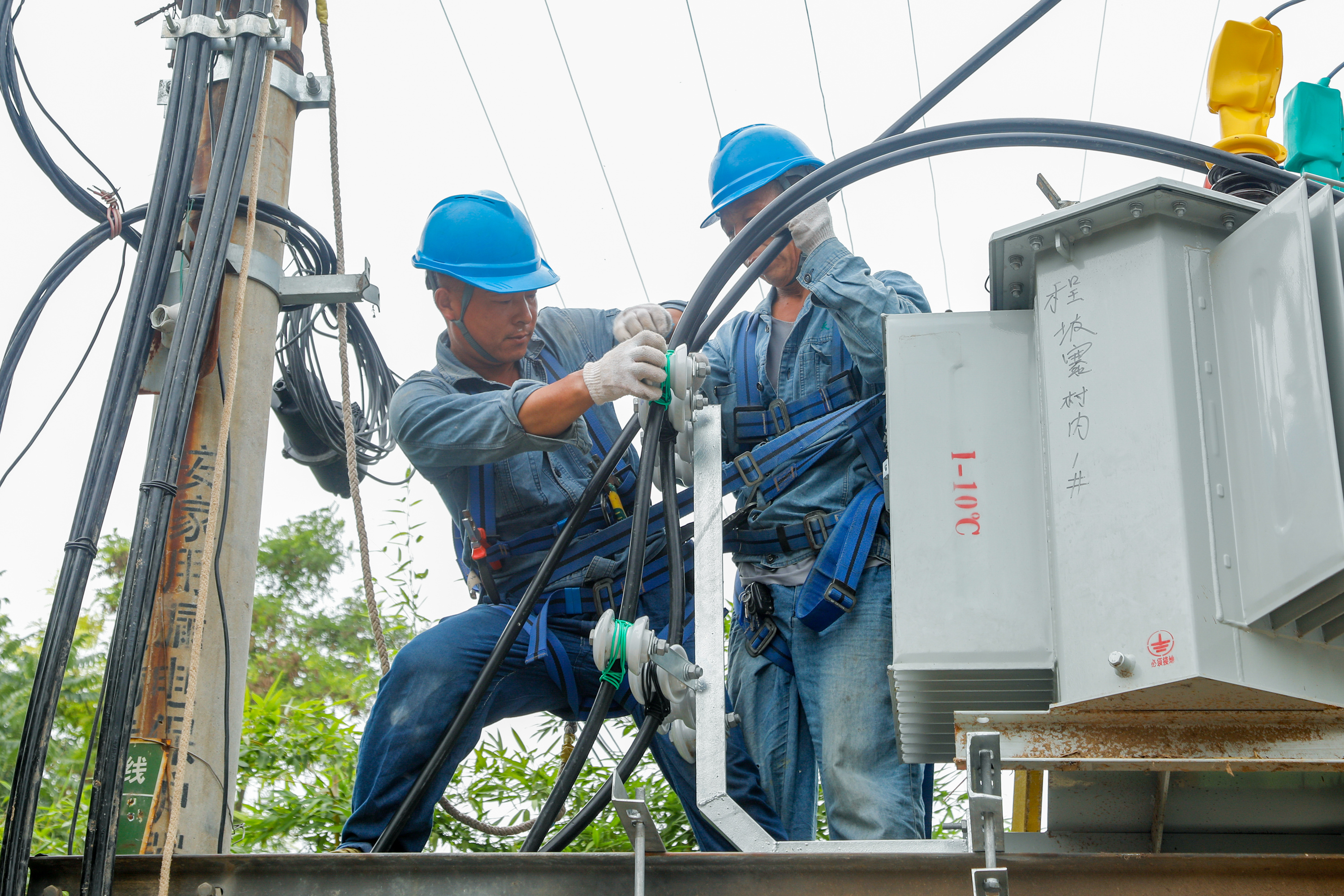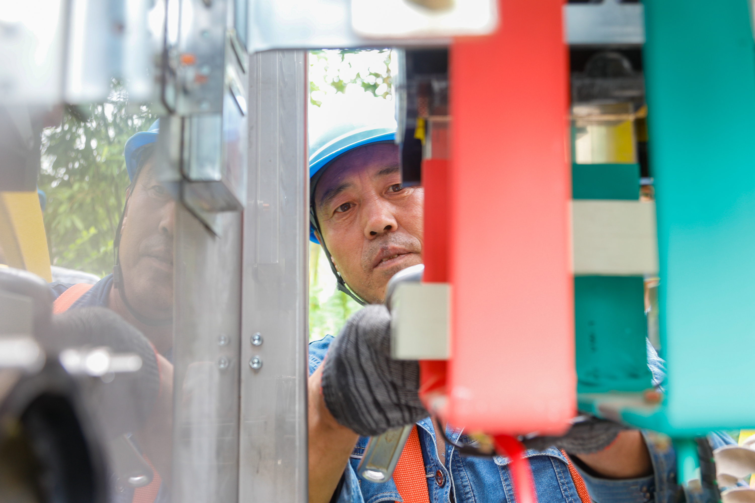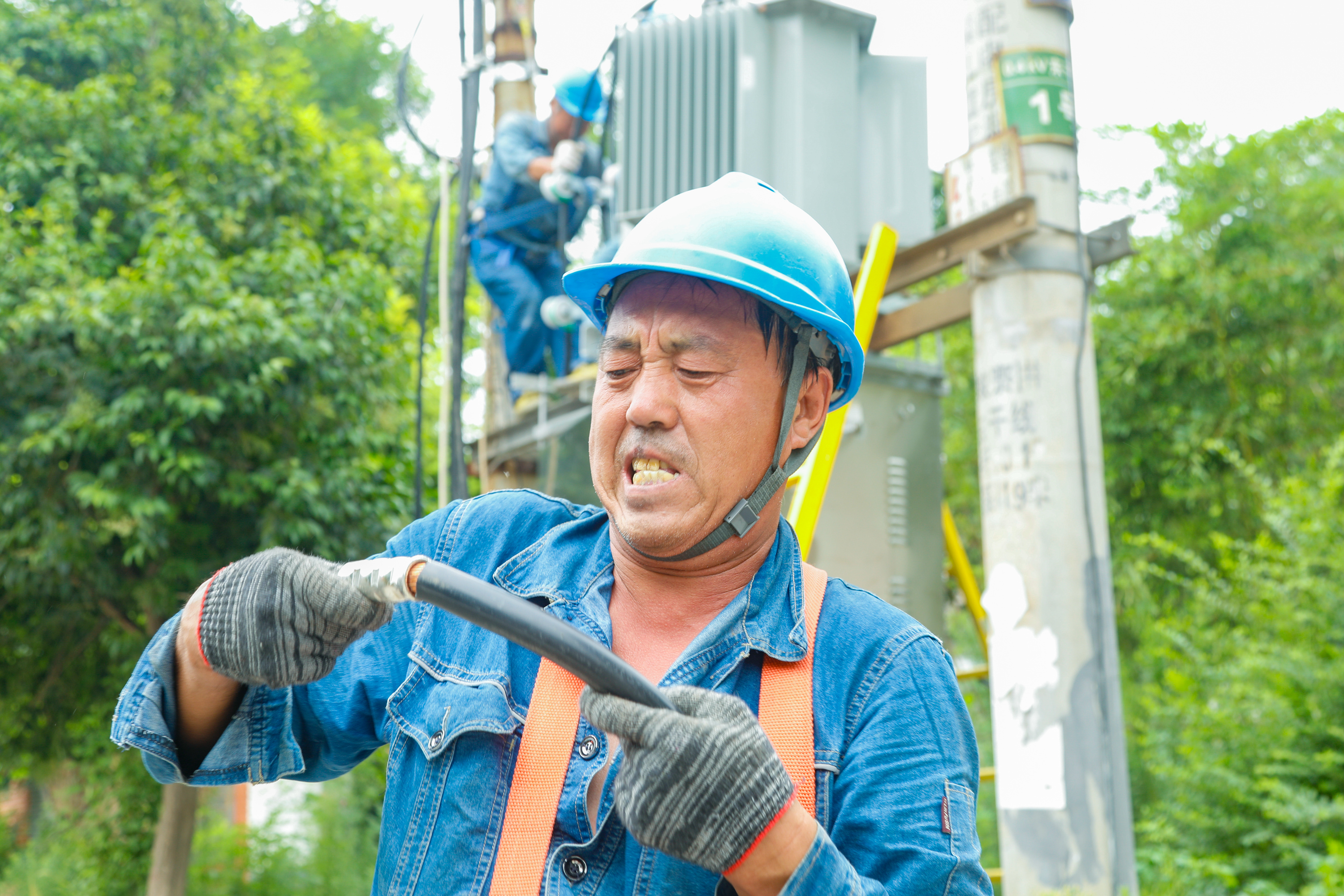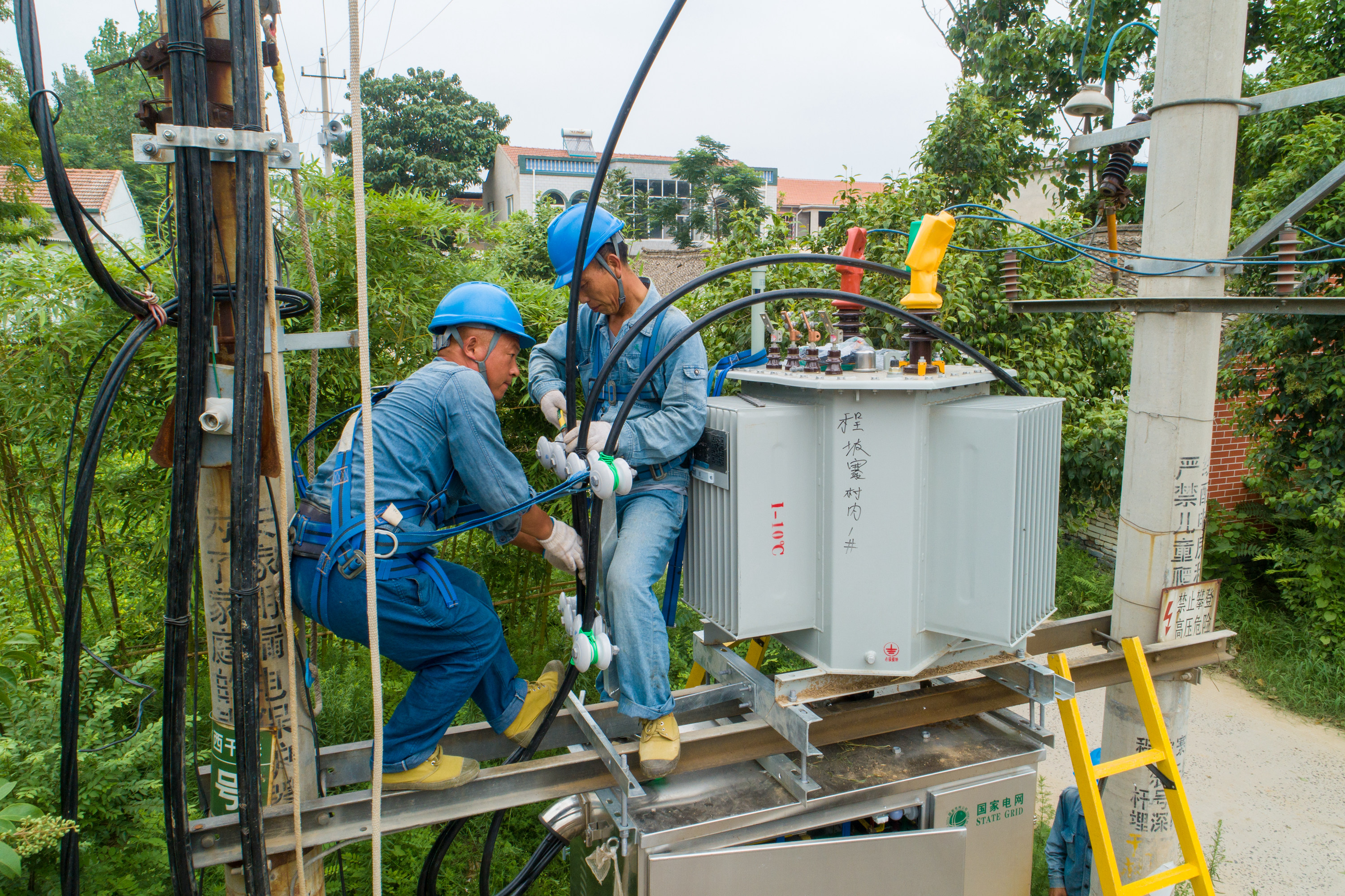 立杆、架线、安装变压器……8月15日,在河南滑县牛屯镇程坡寨村,国网滑县供电公司赵瑞杰、王金有等8名施工人员正进行紧张施工,对村内1号台区进行增容改造。