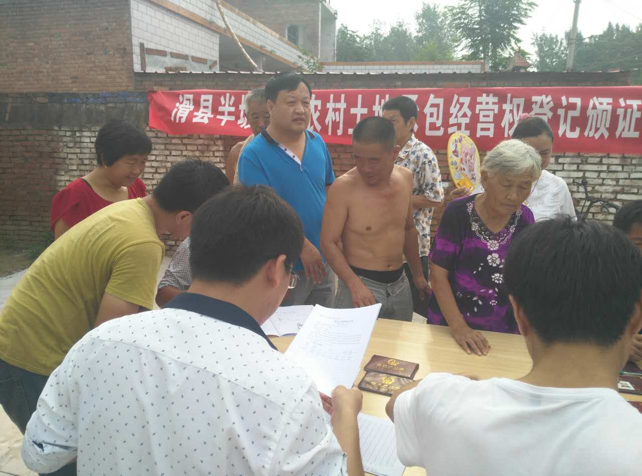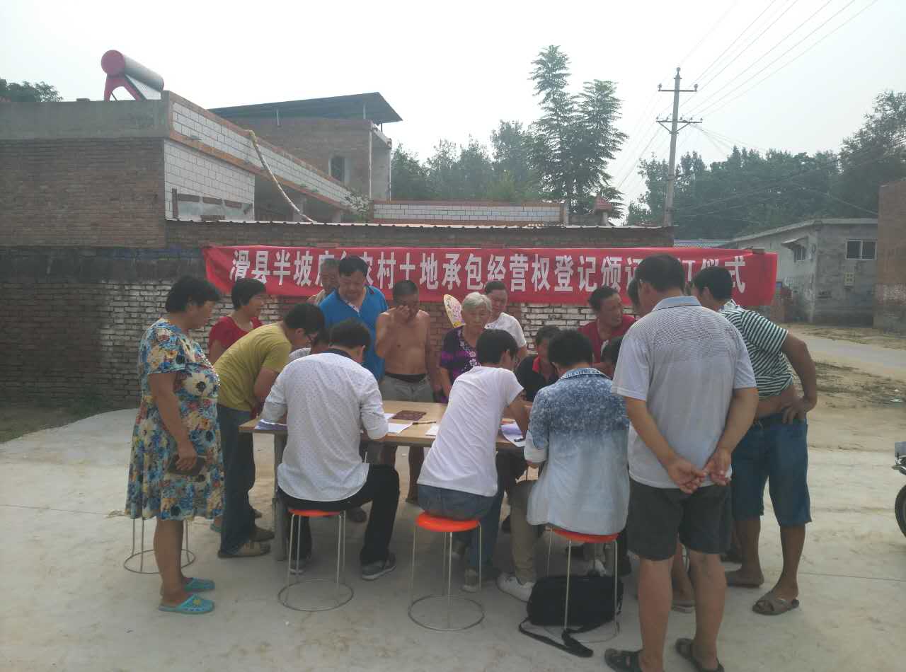 8月14日,半坡店乡政府工作人员利用周末到村颁发农村土地经营权登记证。乡干部将颁证工作送村入户,既节省了广大群众的时间,又免去了他们奔波之苦,受到了广大群众的一致赞扬。