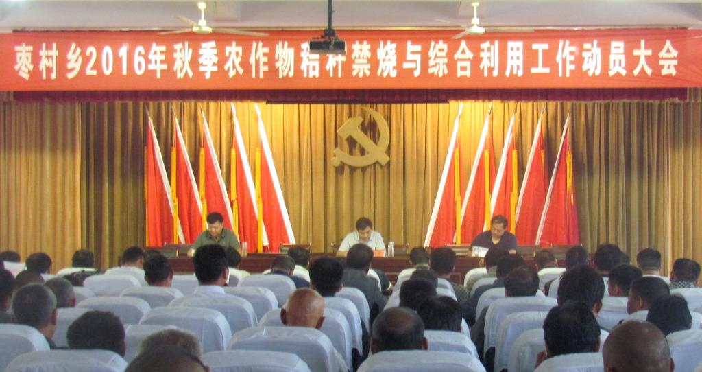 9月20日上午,枣村乡组织乡机关全体干部职工、乡直部门负责人、驻村第一书记和40个行政村两委班子共计280余人,在该乡政府三楼大会议室召开了2016年枣村乡秋季秸秆禁烧动员大会。