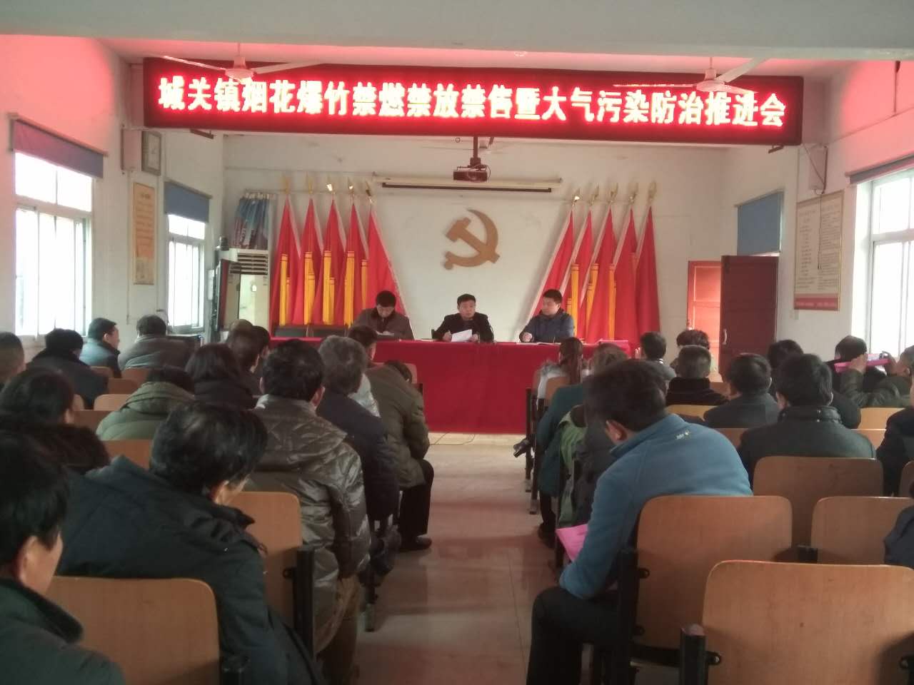 1月18日下午,城关镇在政府二楼大会议室召开了烟花爆竹禁燃禁放禁售暨大气污染防治推进会,镇机关全体干部职工、镇直部门负责人、县城范围内24个村的支书和村长参加了本次会议。
