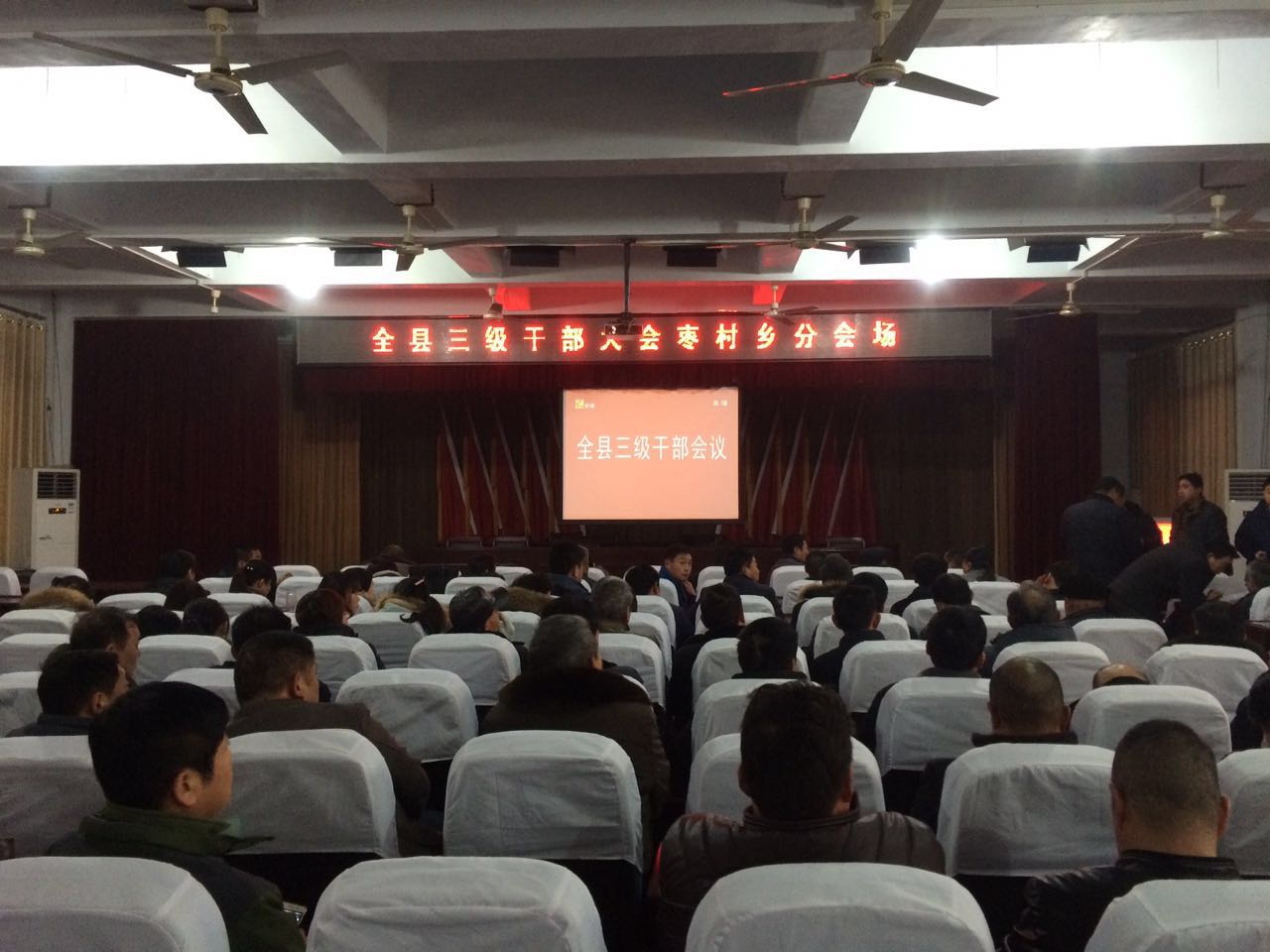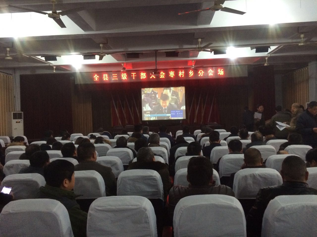 2月4日上午,枣村乡组织40个行政村负责人、机关全体干部职工在三楼大会议室收看全县三级干部大会。