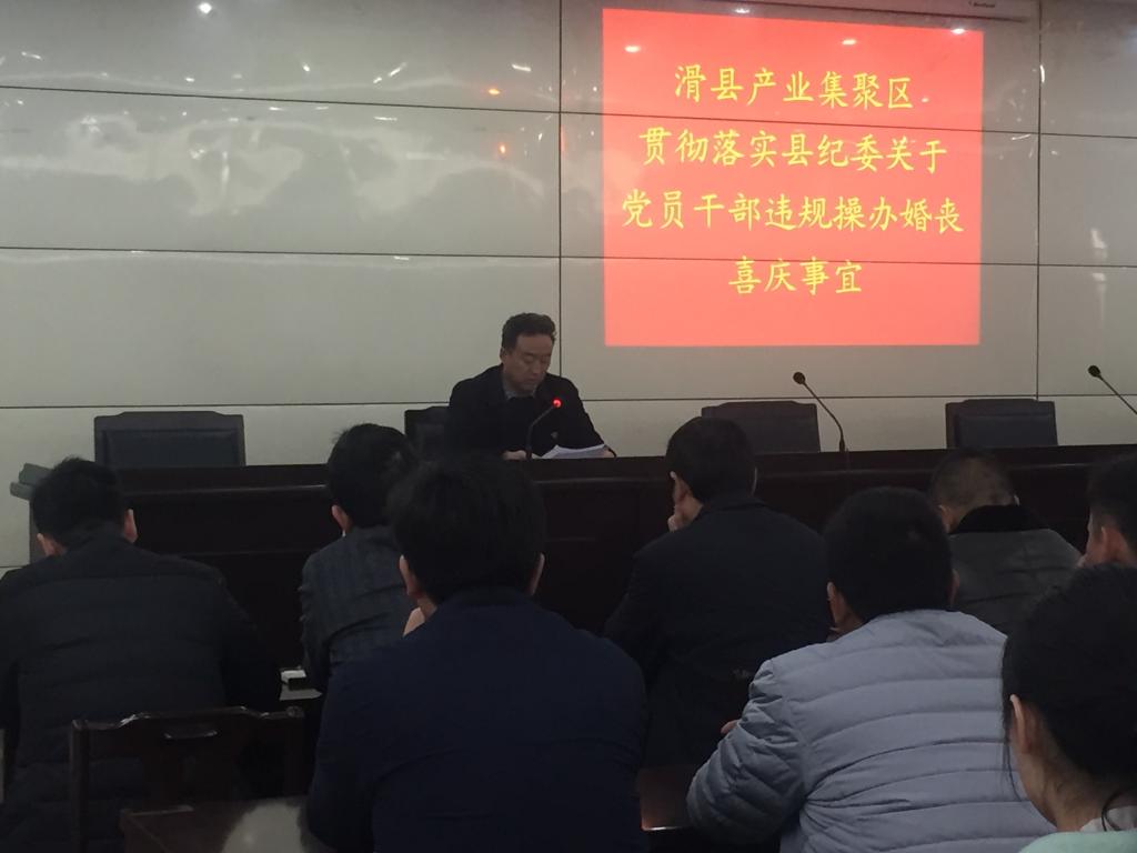 为贯彻落实县纪委印发的《关于对部分党员干部违规操办婚丧喜庆事宜问题的通报》(滑纪通2017[2]号),3月2日上午,产业集聚区党工委副书记、管委会副主任宋培哲组织全体机关干部在六楼会议室传达学习了该文件精神。