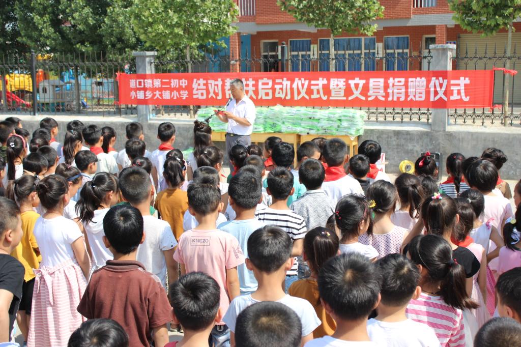 5月26日上午,道口镇第二初中与小铺乡大铺小学结对帮扶启动仪式暨文具捐赠仪式在小铺乡大铺小学隆重举行。