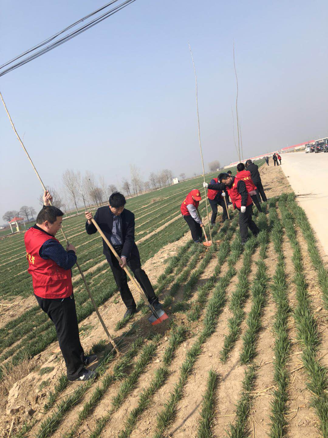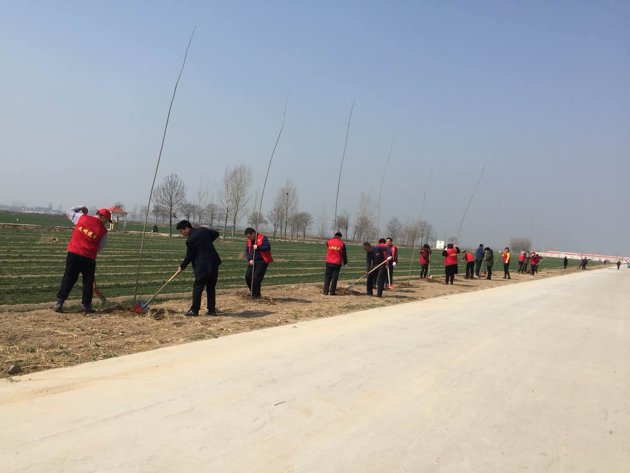 3月12日中午,万古镇机关全体干部职工和文明使者放弃午休时间,到该镇光明乳业奶牛场入场道路两侧开展义务植树活动。