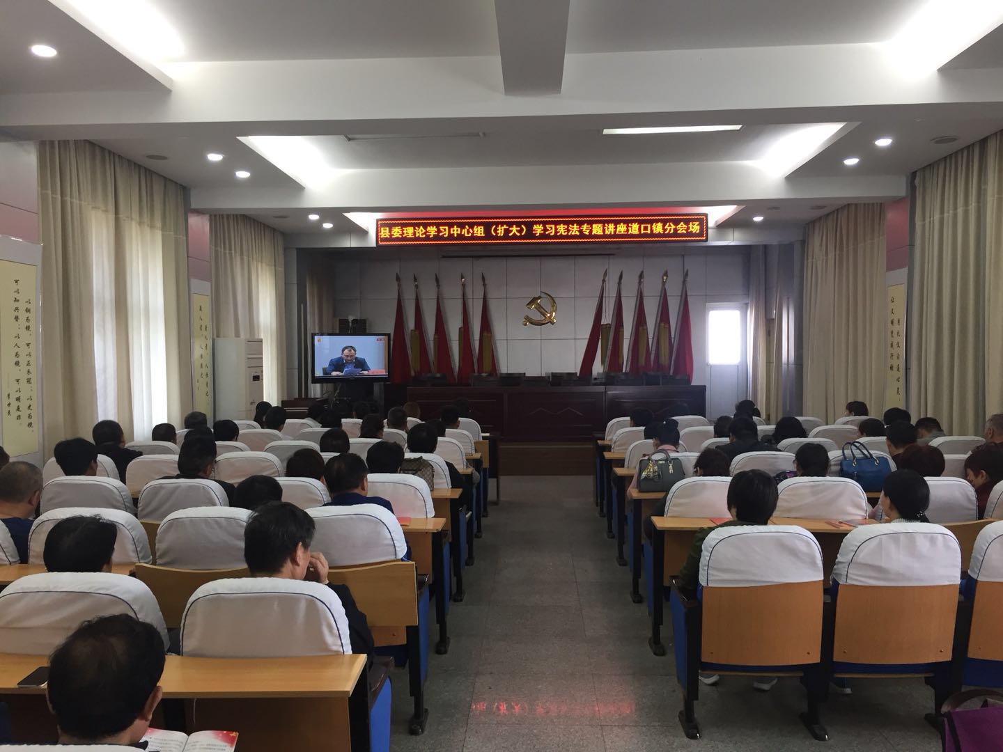 为不断增强拥护宪法、维护宪法的自觉性,4月28日上午,道口镇街道办组织机关全体及各村“两委”干部收看县委理论学习中心组(扩大)学习宪法专题讲座视频直播。