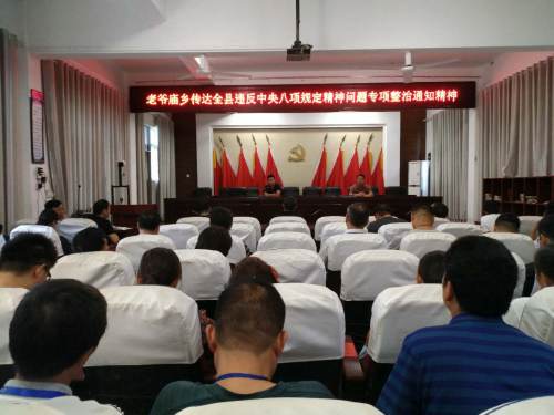 9月5日上午,老爷庙乡积极组织乡村两级干部在乡大会议室召开会议,会议传达了全县违反中央八项规定精神问题专项整治通知精神及全县开展整治“帮圈文化”专项排查通知精神。