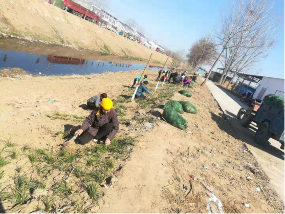 在五干排河堤两岸种植麦冬出动义务工450人次,种植面积40000多平方米;在五干排、四万路沟沿撒种草籽共120000平方米。