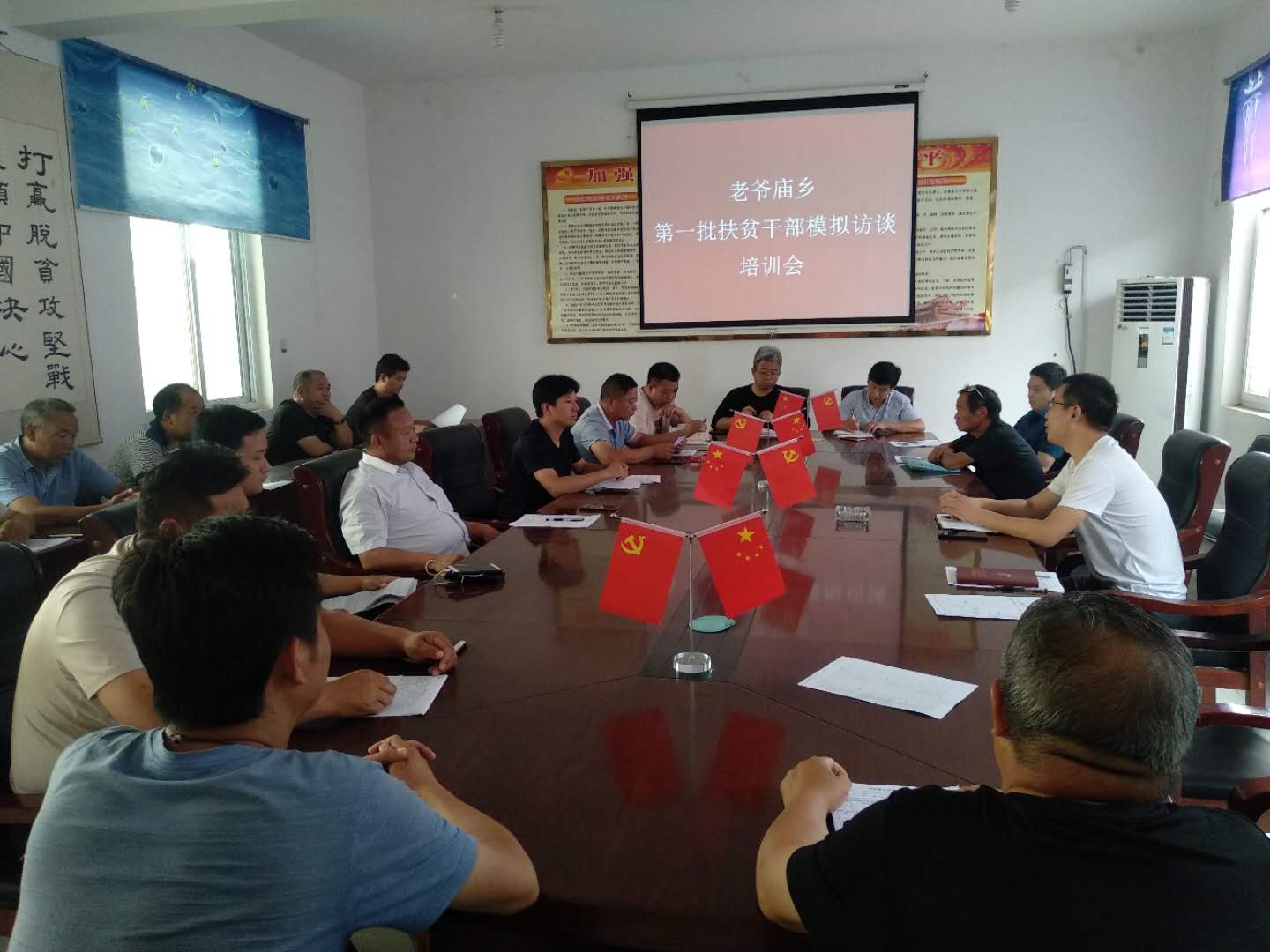为提升脱贫攻坚工作成效,老爷庙乡对全乡58个行政村的第一书记、村支部书记分5个批次进行扶贫知识培训和模拟访谈。6月21日下午3:00,在乡政府三楼会议室开展第一批扶贫干部业务知识培训及模拟访谈会议。
