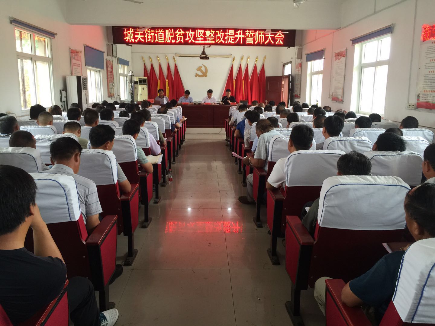 会上,总结了上半年脱贫攻坚工作,部署安排了整改提升工作,6个区包区领导及部分帮包责任人作了表态发言,街道办主任孙战立宣读了脱贫攻坚整改提升指挥部名单及奖惩督导办法,街道党工委书记赵宪海下达了脱贫攻坚战令,明确了村级脱贫攻坚问题清单和整改要求,要求全体人员认清形势,找准站位,正视差距,狠抓整改不懈怠;转变作风,立即行动,克难攻坚,强抓落实不放松;提振精神,明确责任,奖惩分明,严抓纪律不手软,确保脱贫攻坚成效再提升。