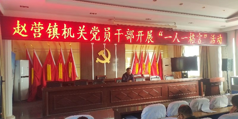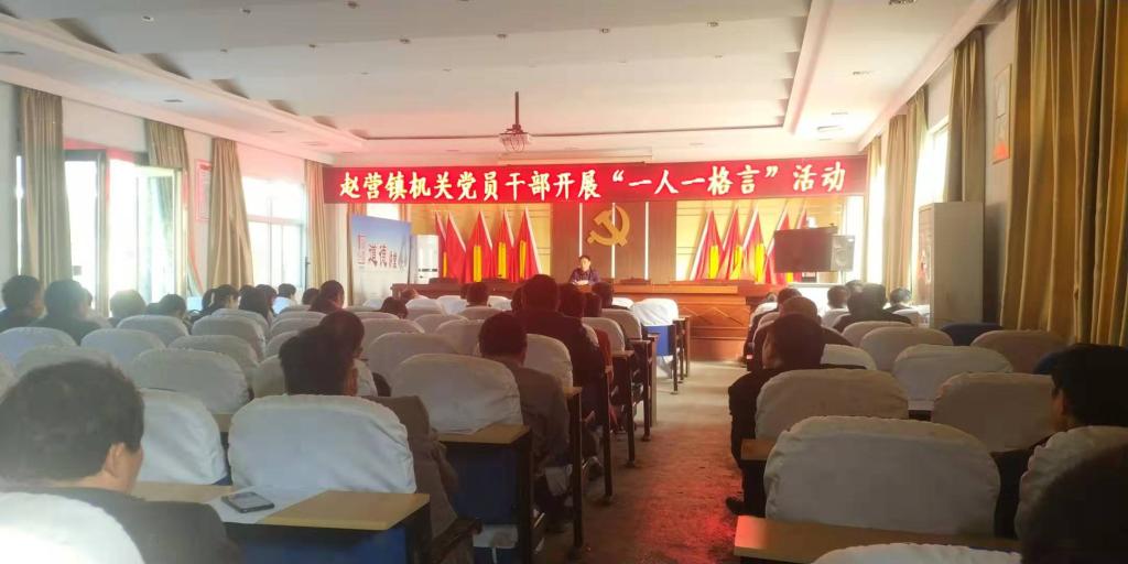 活动中,赵营镇相关负责同志鼓励全体党员干部以短句、格言警句的形式,结合《习近平用典》、《平语近人》等书籍,围绕廉洁勤政、敬业奉献、为民务实、爱国守法等主题,紧密结合自身的工作、生活理念,挑选一句对自己触动最深、影响最大,能反映学习心得的语句作为自己的格言,充分展示党员践行宗旨、为民服务的坚定信心和决心,从而达到自省、自警、自勉的效果。
