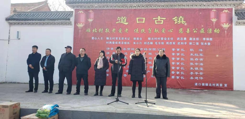 1月19日上午,顺北村两委联合滑县顺北万富农贸批发市场、滑县宏大纺织有限公司、河南海恩食品有限公司、河南省银海食品有限公司、顺北顺德利水产冷库、滑县荟萃楼珠宝六家爱心企业及社会爱心人士举办第二届“敬老爱老 促扶贫献爱心”慈善公益活动,筹资4万余元,为全村70岁以上老人、60岁以上党员以及贫困户、建档立卡贫困户、低保户发放大米、面粉、食用油及慰问金。