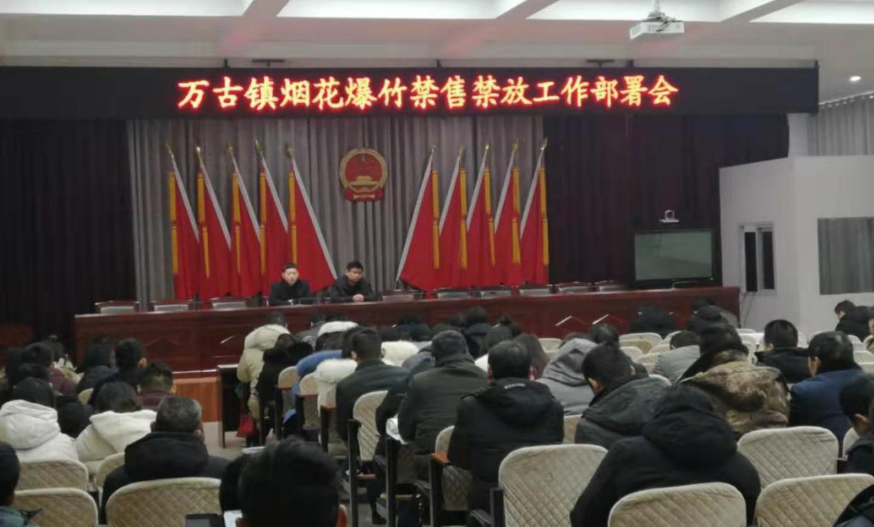 全县烟花爆竹禁售禁放工作推进会召开后,万古镇党委政府高度重视,迅速安排部署,1月15日召开了全体机关干部、各村“两委”全体及镇直部门负责人参加的烟花爆竹禁售禁放部署会。