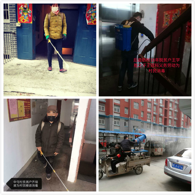 宅在家是群众的社会责任,也是应对疫情的有效武器。锦和街道中屯村齐培浚、齐培占等贫困户却选择放弃宅在家,冲到一线义务为全村村民进行消毒,他们分工合作,负责小区楼道、地下室、垃圾堆放点、小区院内等消毒工作,给小区居民创造了良好的环境。