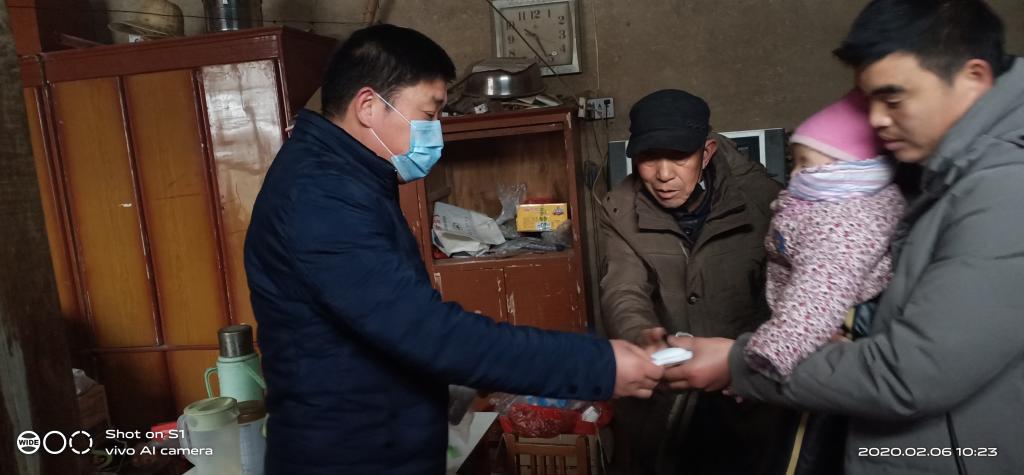 “大叔,来给您送些防护口罩。”2月6日,万古镇范寨村村主任栗松竹将镇里发放到口罩送到未脱贫贫困户栗士敏家中。疫情防控战役打响后,万古镇考虑到贫困户自身经济条件差、身体抵抗力较弱、防范意识不高等实际,积极行动,组织包村干部、村“两委”干部为他们送去口罩等防护物品,宣传普及疫情防控知识,引导他们做好科学防范,做到在疫情防控阻击战中不让一个困难群众“掉队”。