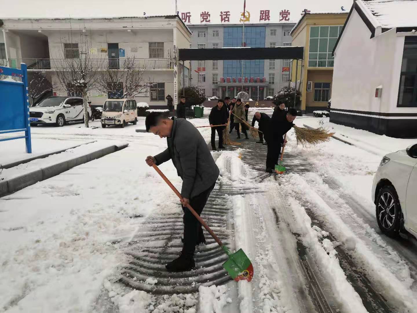 2月25日早上,20余名乡机关干部不顾天寒路滑,积极主动拿起铁锨和扫帚,铲的铲,扫的扫,齐心协力、干劲十足,对乡机关院内和道路上的积雪进行清扫,为过往群众和车辆的出行提供便利,消除安全隐患。