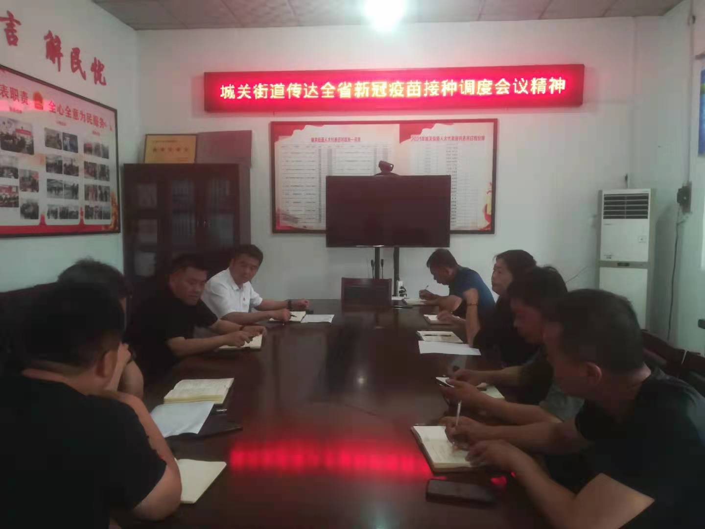 6月17日下午6点,全省新冠疫苗接种工作调度会结束后,城关街道召开班子会,迅速传达会议精神。