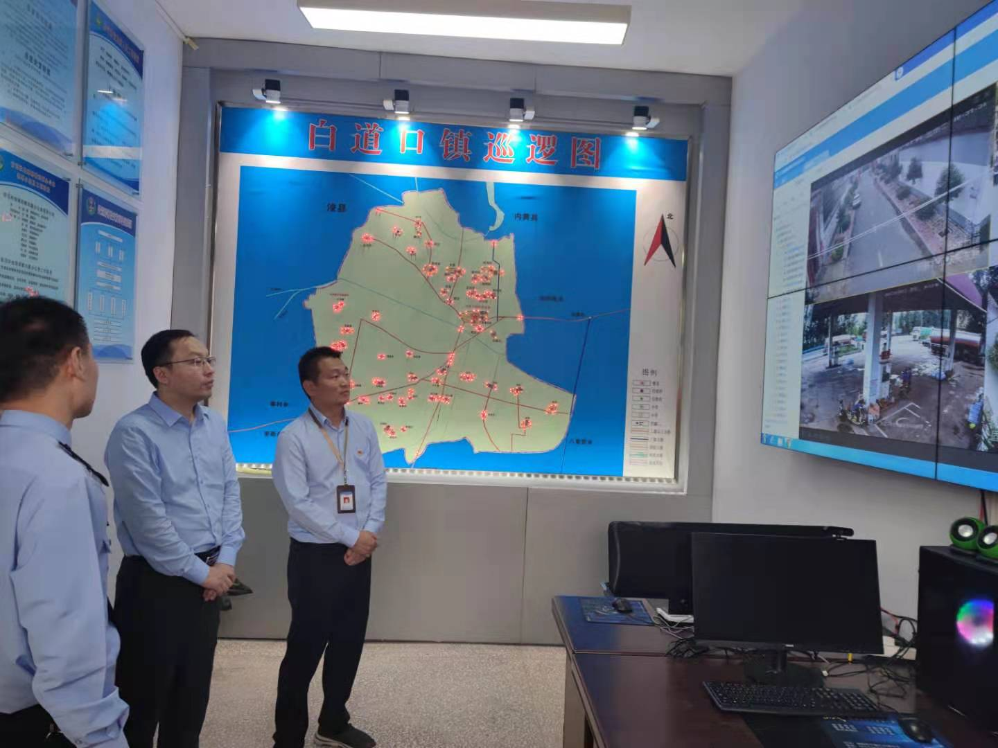 在镇综治中心,耿昆介绍了镇综治中心的运行情况及白道口镇“雪亮工程”建设情况,郭晓在视频监控室仔细查看了“雪亮工程”的运行情况。
