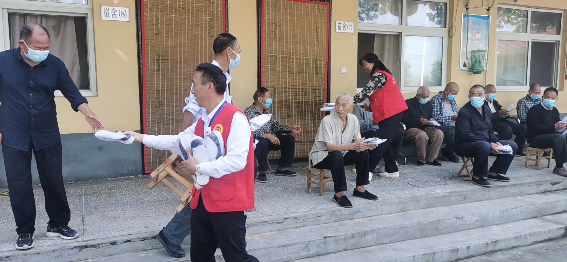 志愿者们到敬老院将一双一双鞋子按尺码送到他们手中。