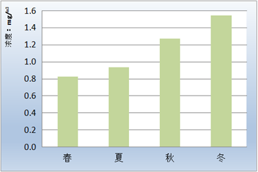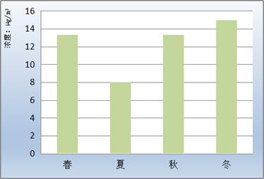 一氧化碳各月第95百分位数浓度、季第95百分位数浓度变化见表6、图9和图10。冬季浓度最高,秋季次之,春、夏季较低。